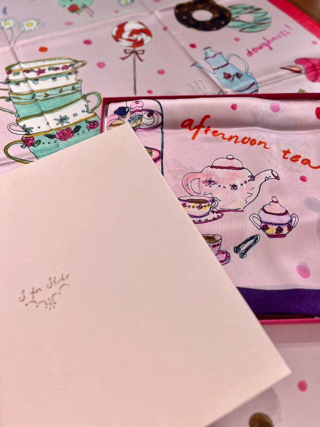 S for Shokoで毎シーズン人気のシルクスカーフ、アフタヌーンティー柄ピンクが