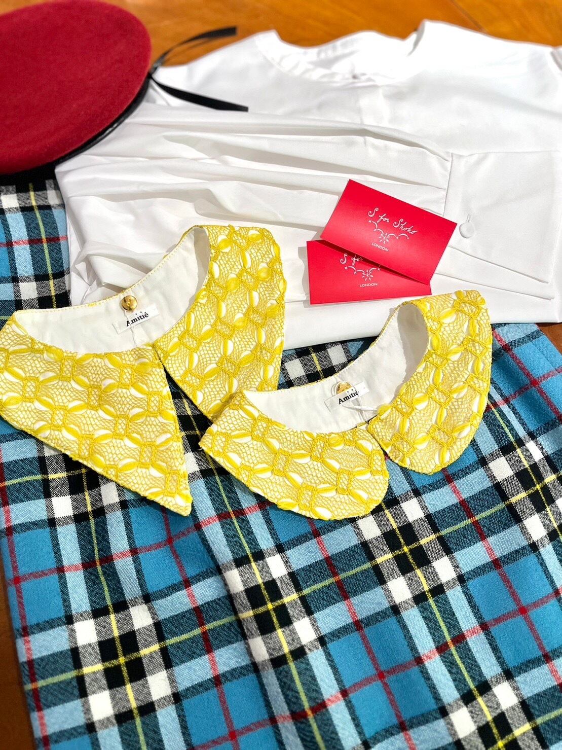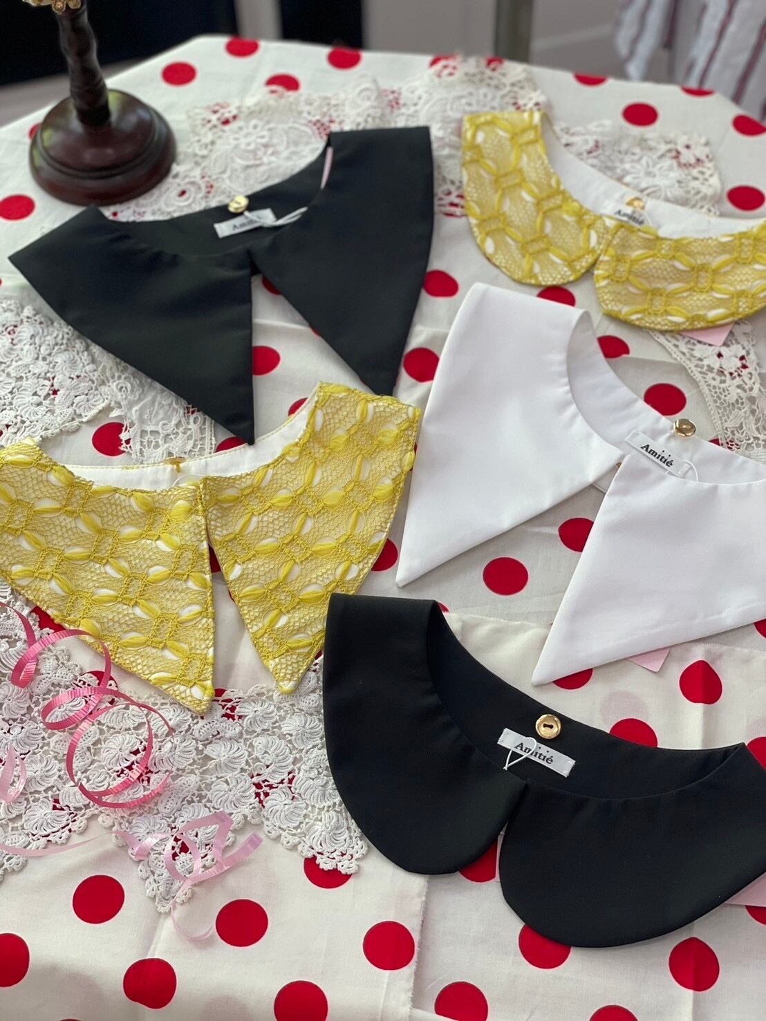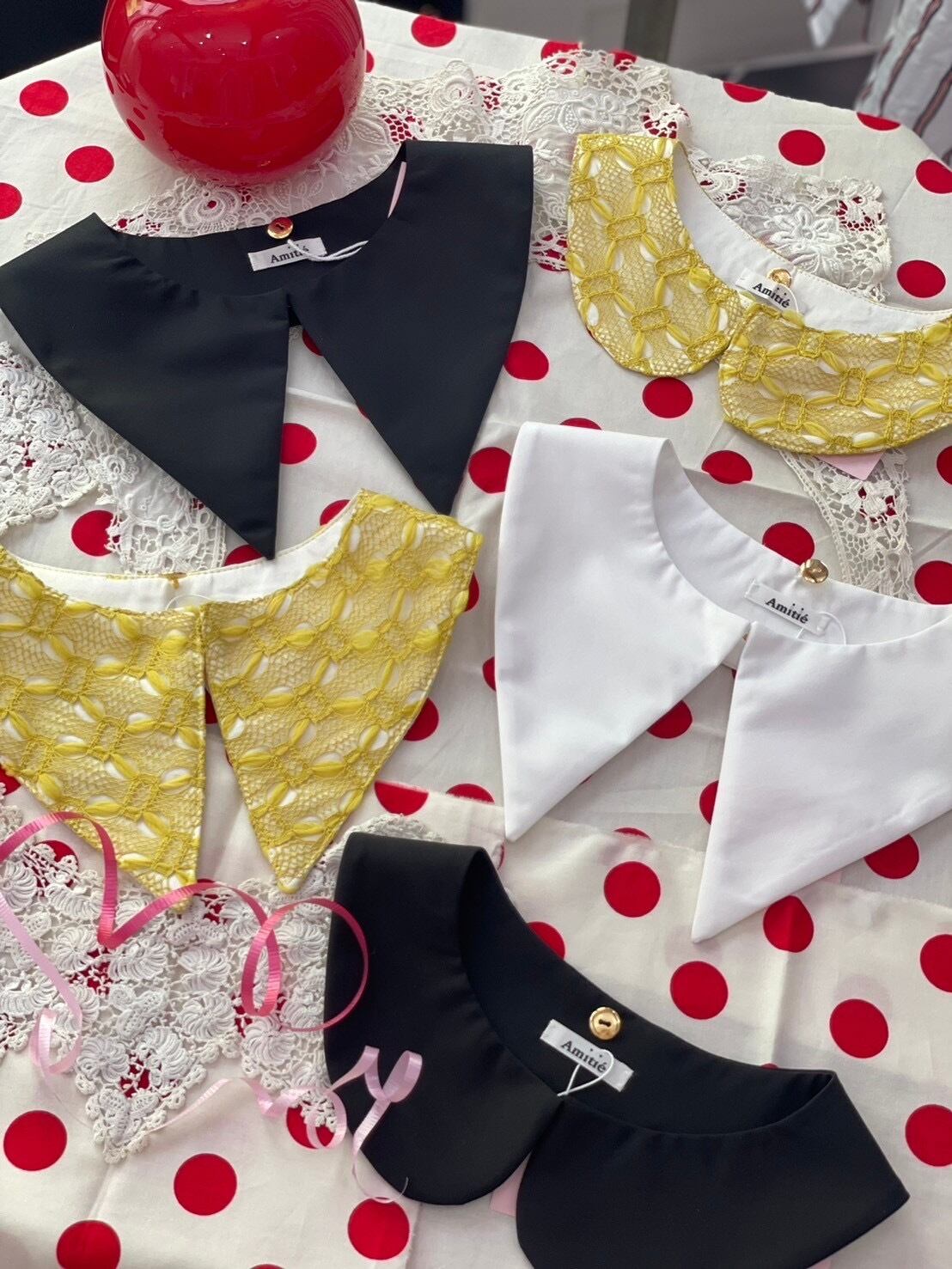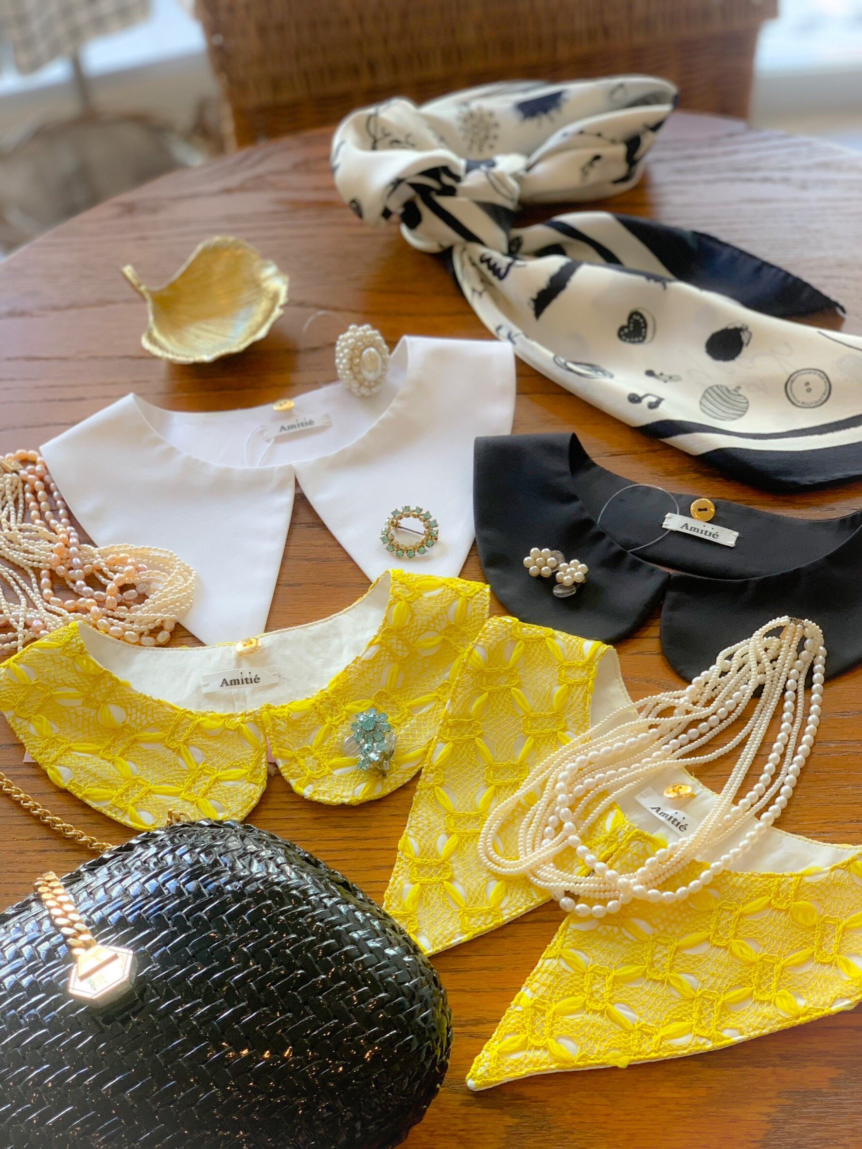 Amitiéでは、初めてのファブリックのレースのつけ襟は上品でおしゃれな印象となります。コーディネートのアクセントでもおすすめな黄色のお色は