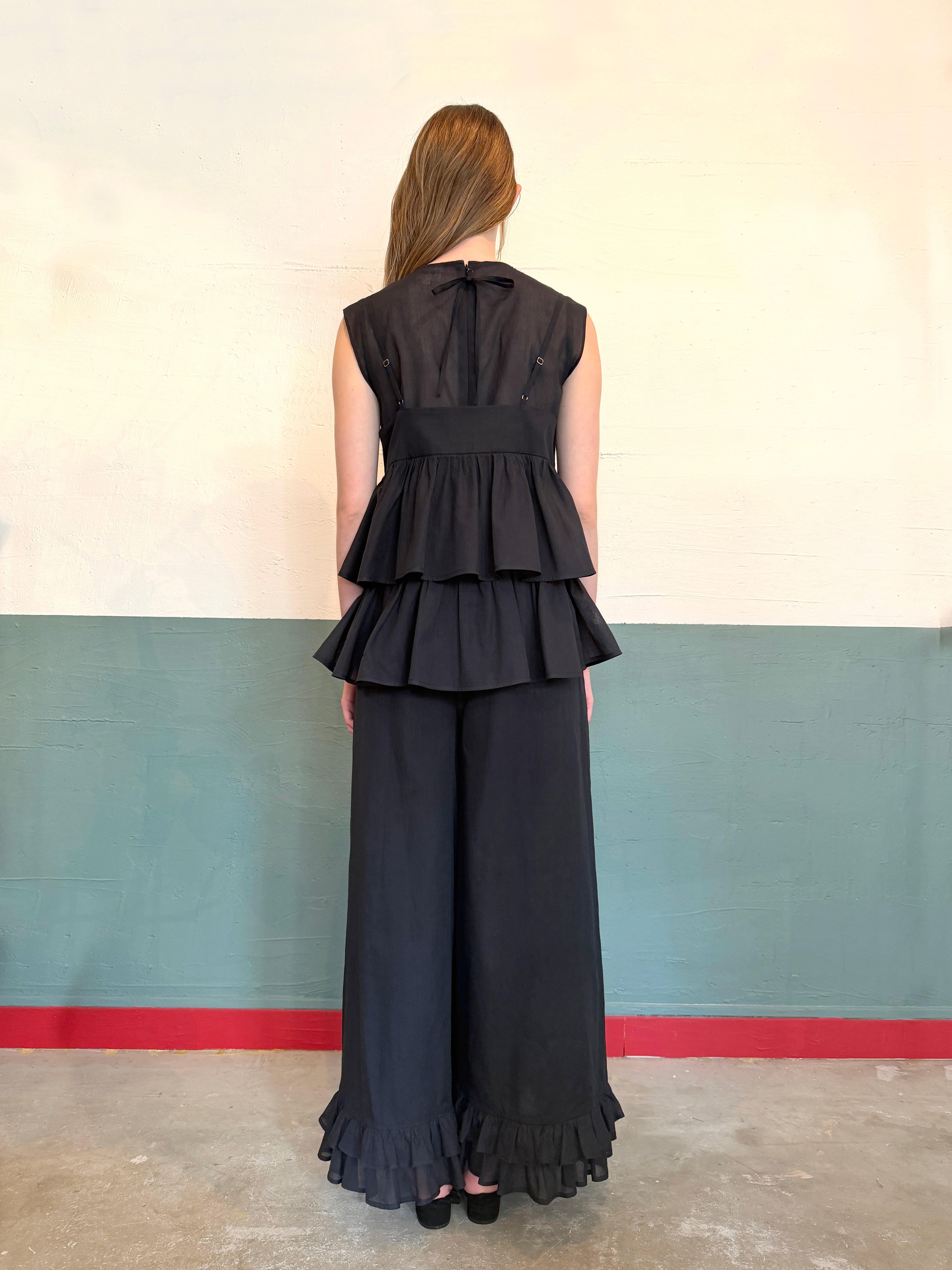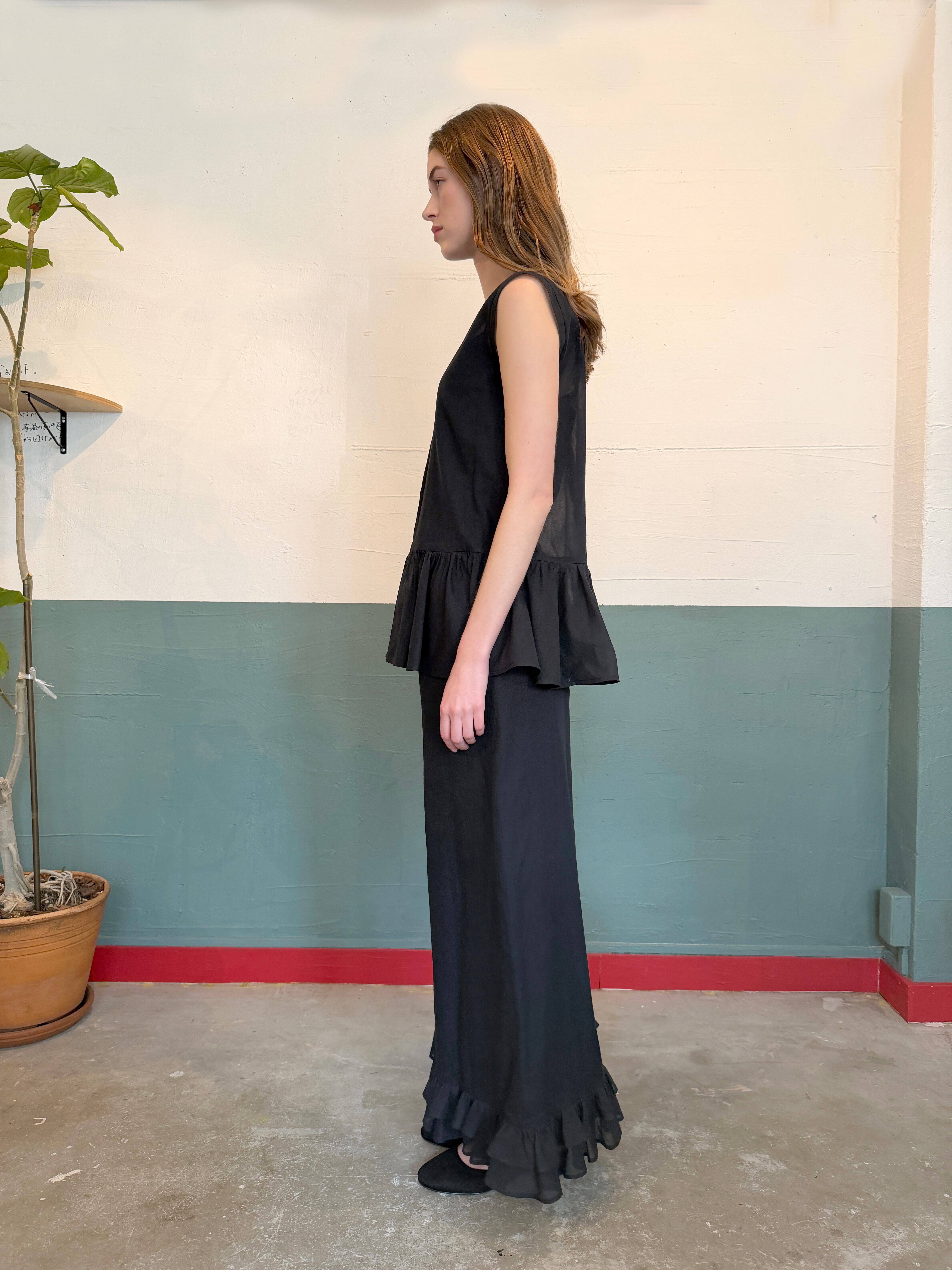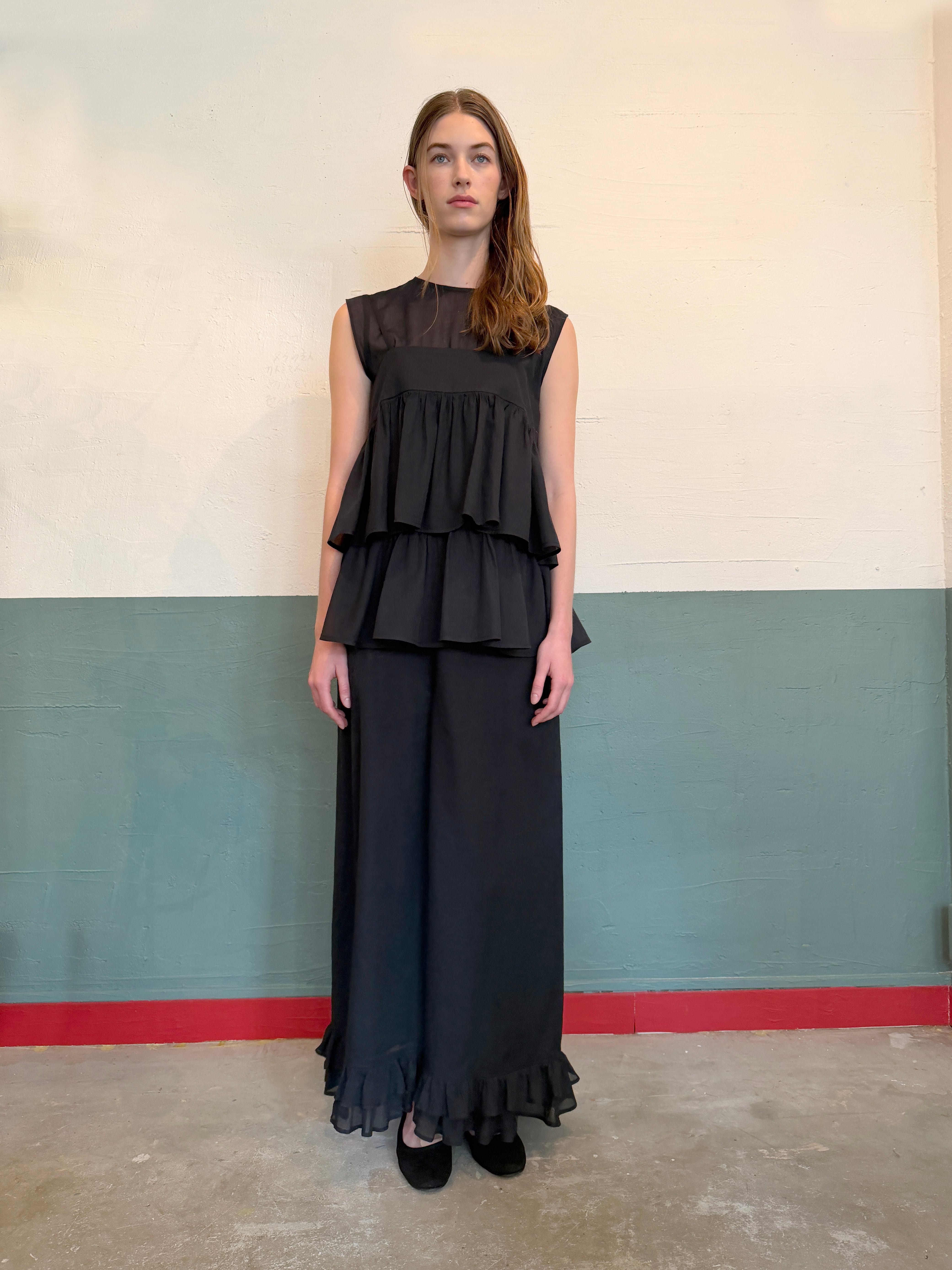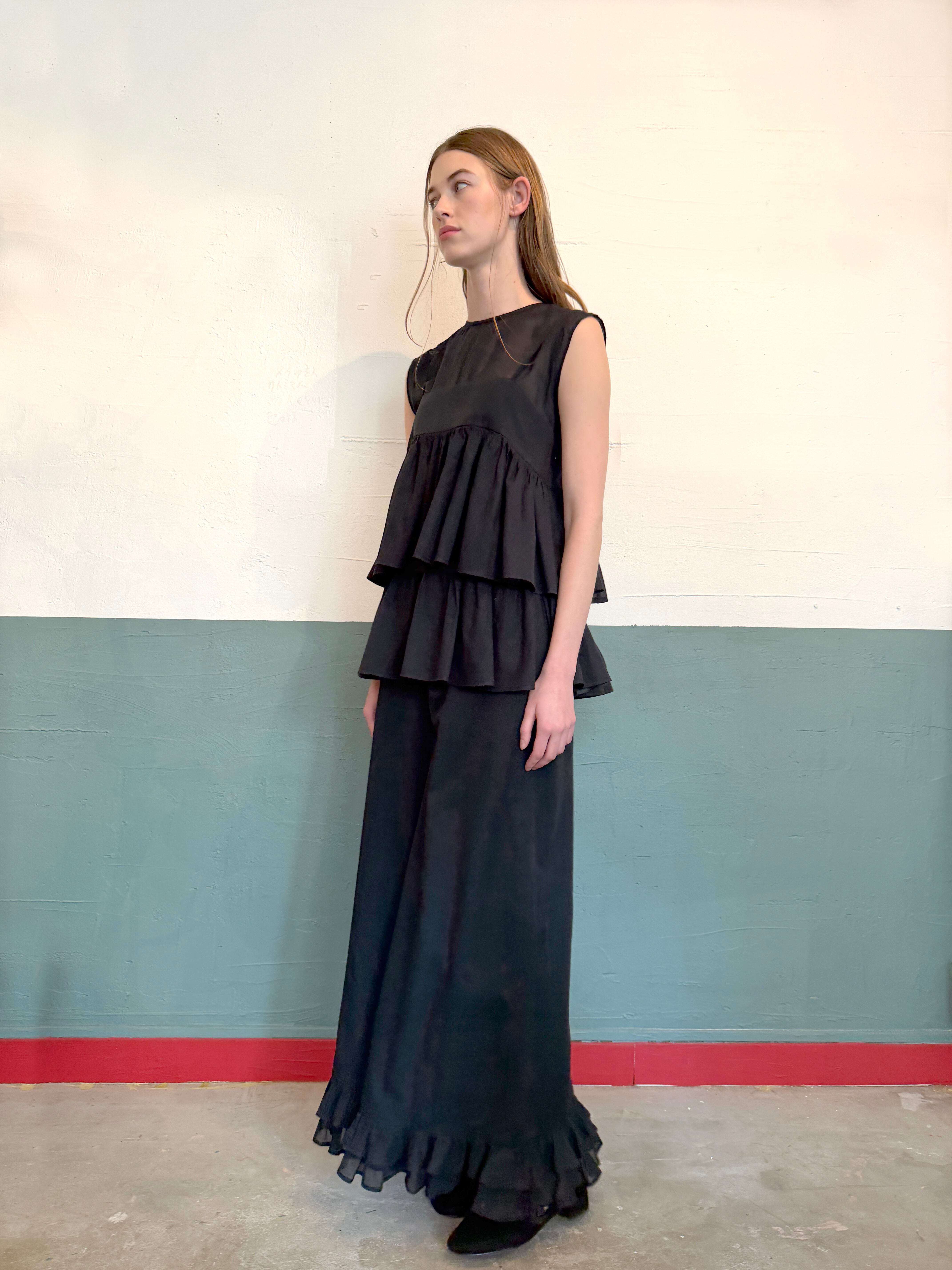 【2026SS受注アイテム】裾フリル・ダブルワイドパンツ ブラック(透け感)