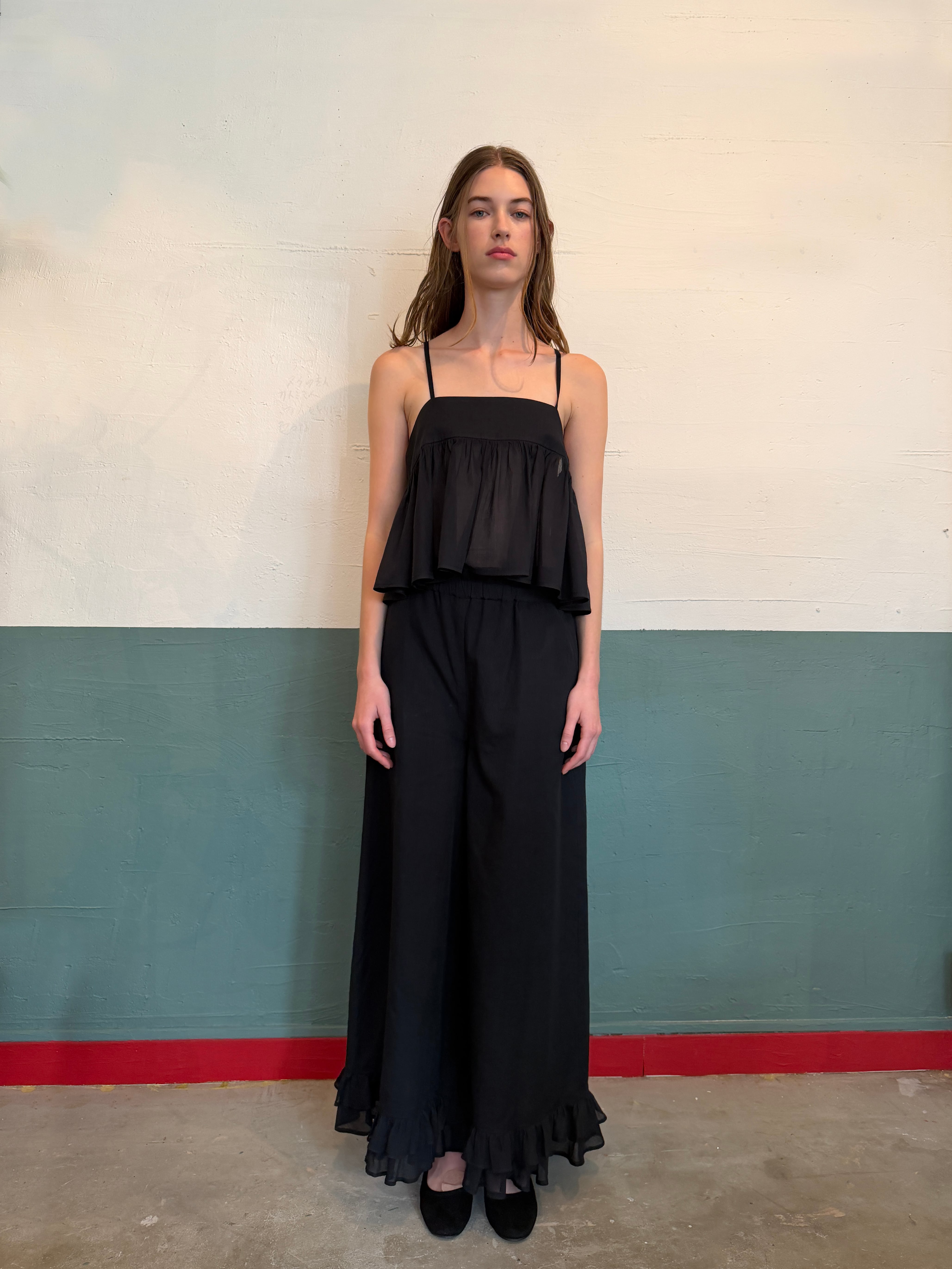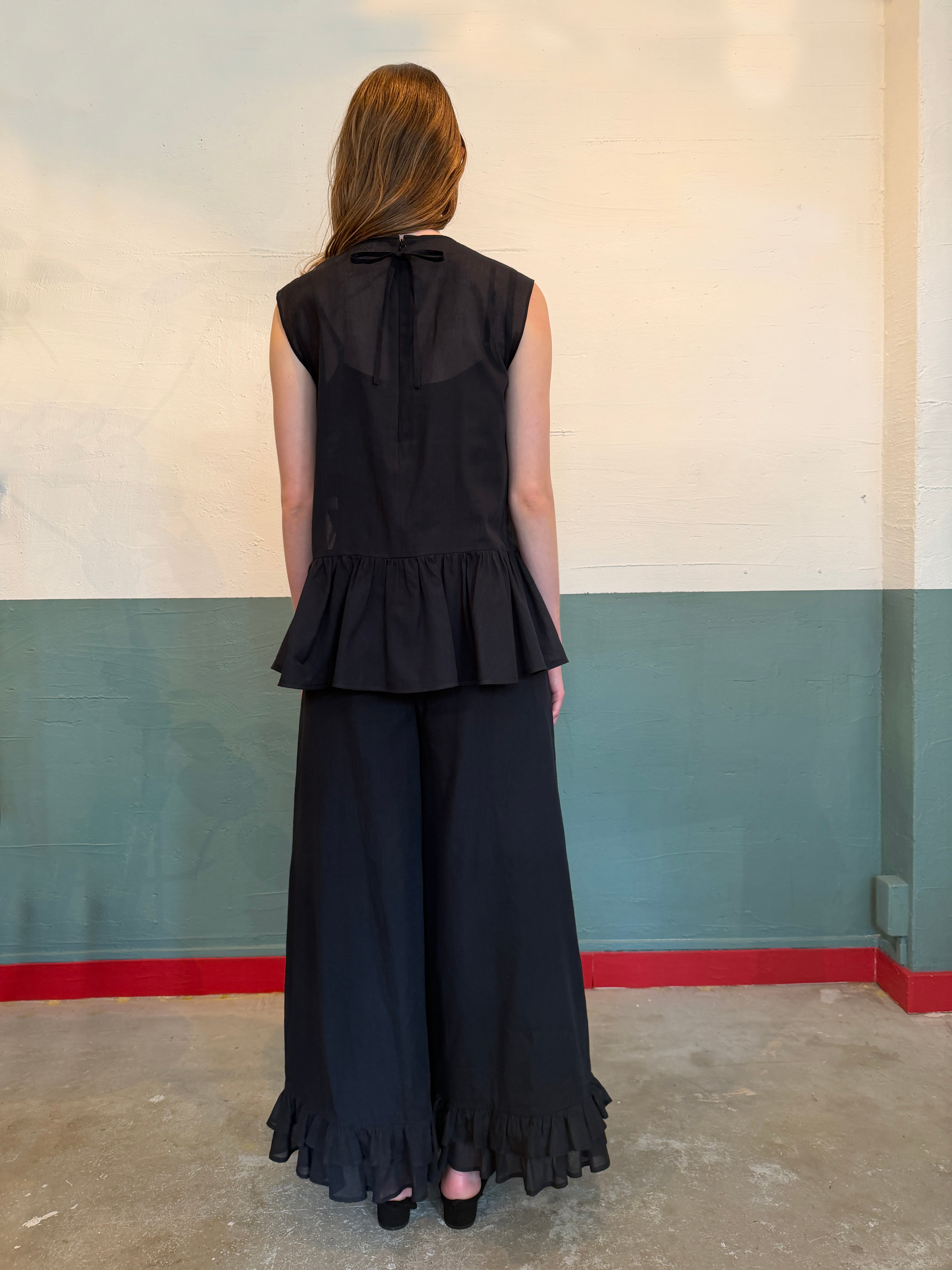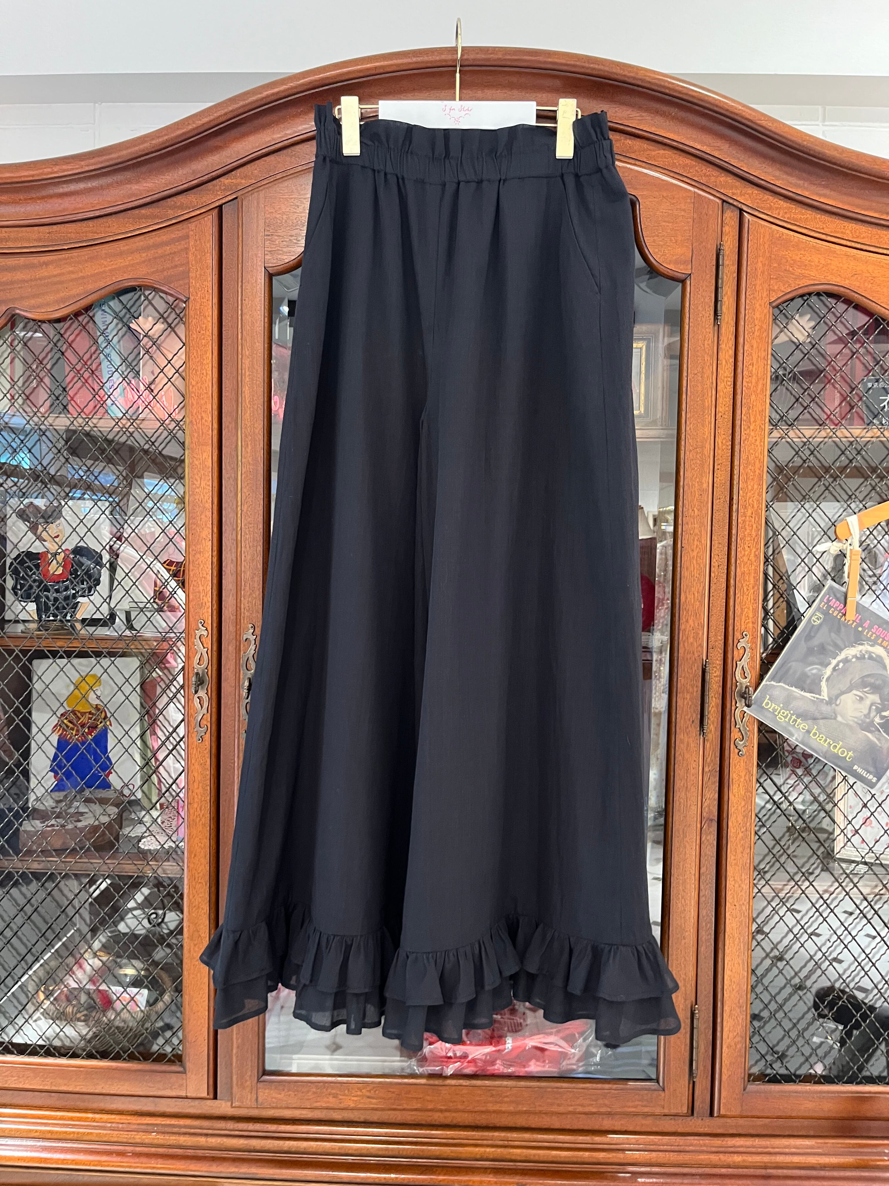 裾フリル・ダブルワイドワイドパンツ ブラック(透け感のある上質インド綿)