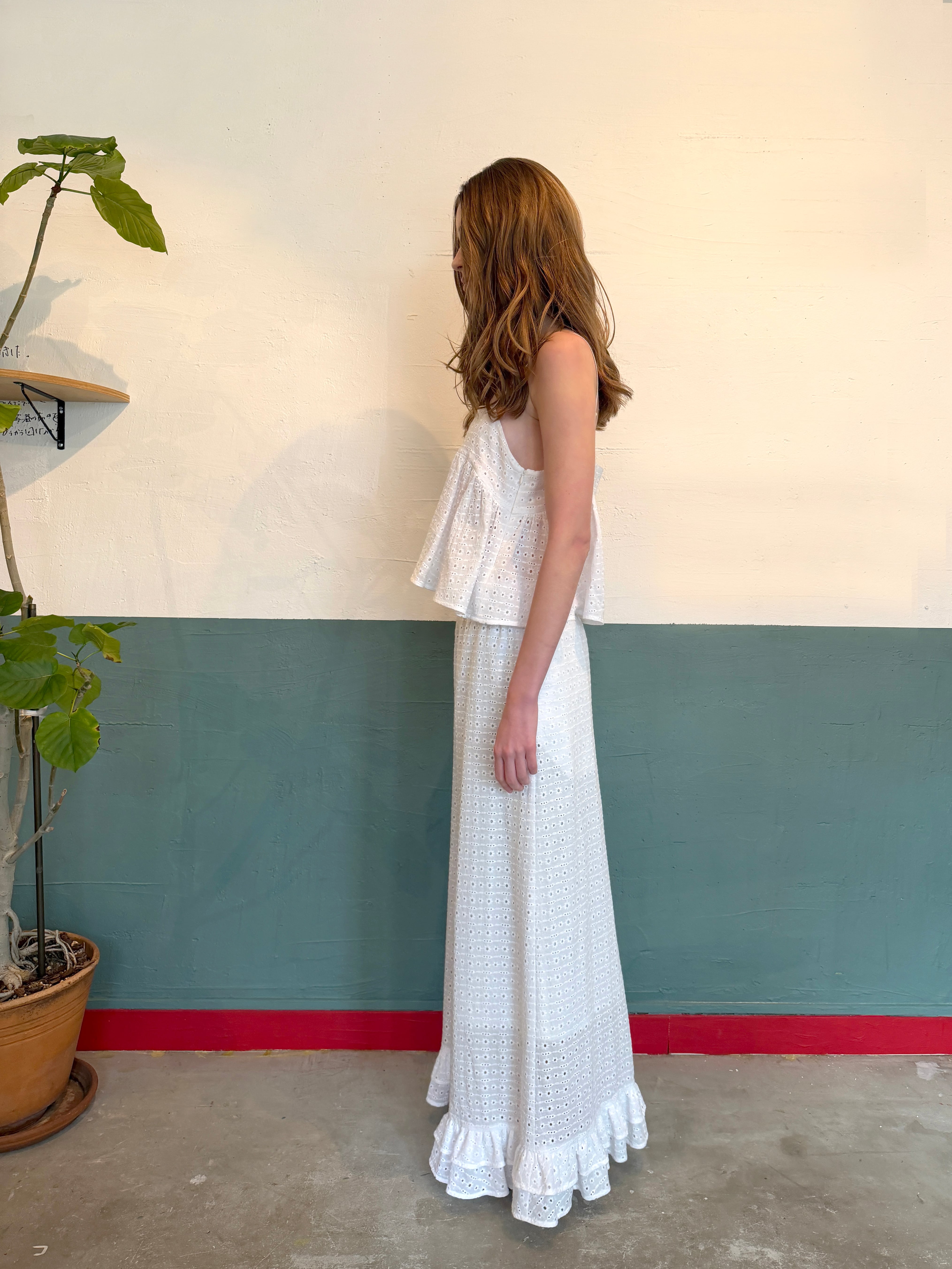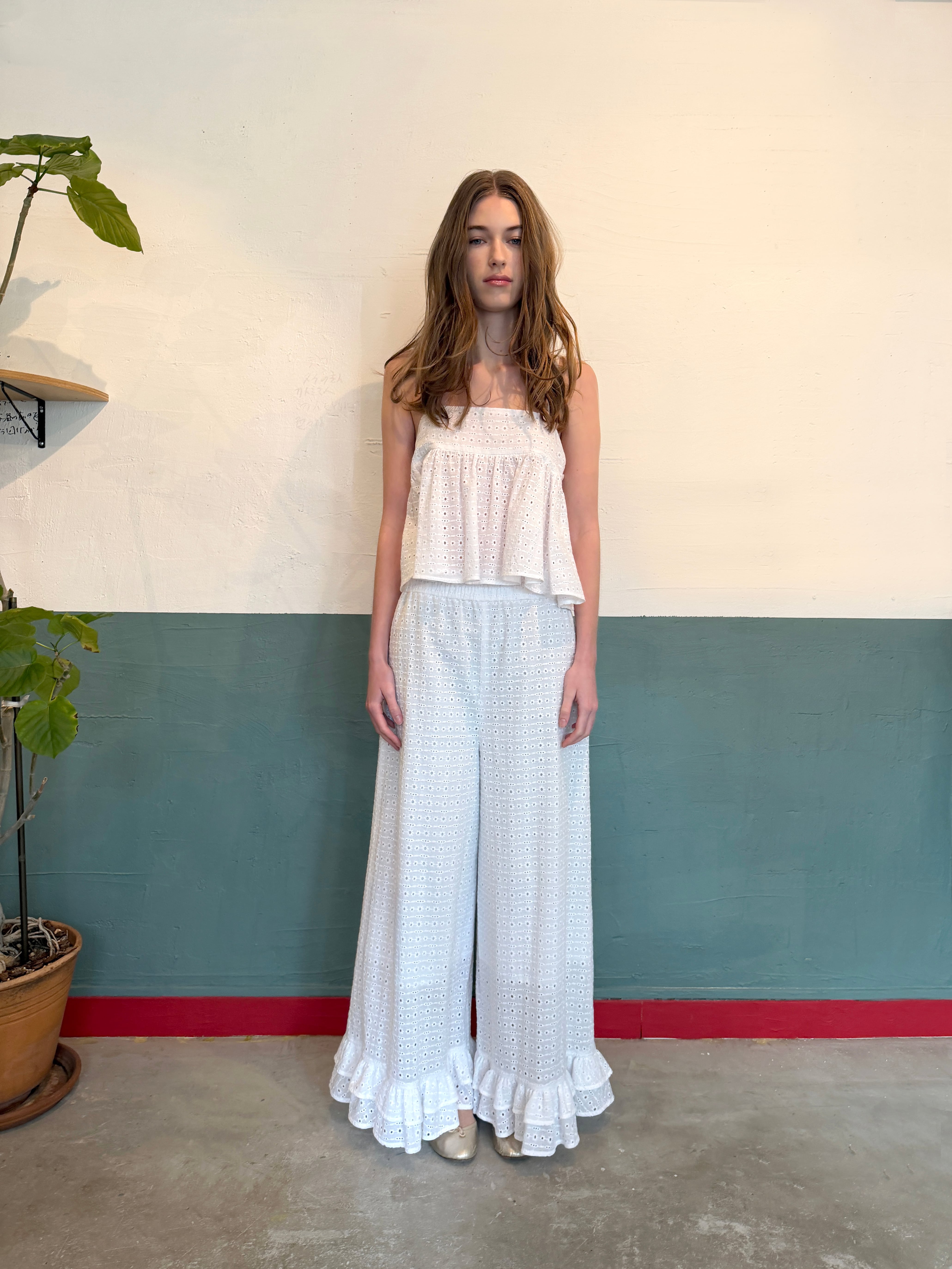 白レース素材のセットアップでも、ソフトデニムの裾フリル・ダブルワイドパンツの組み合わせもおすすめです。