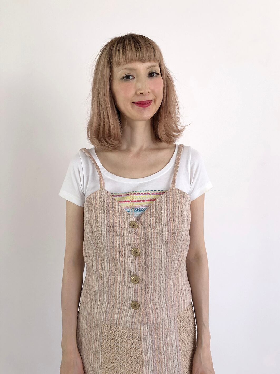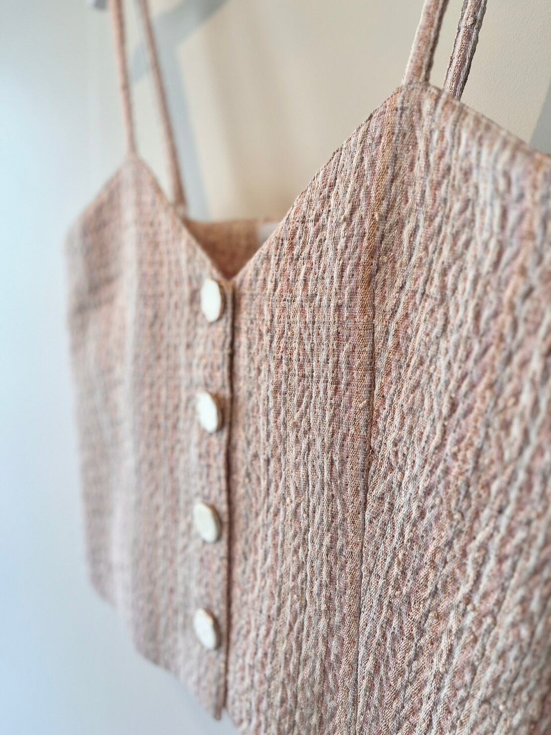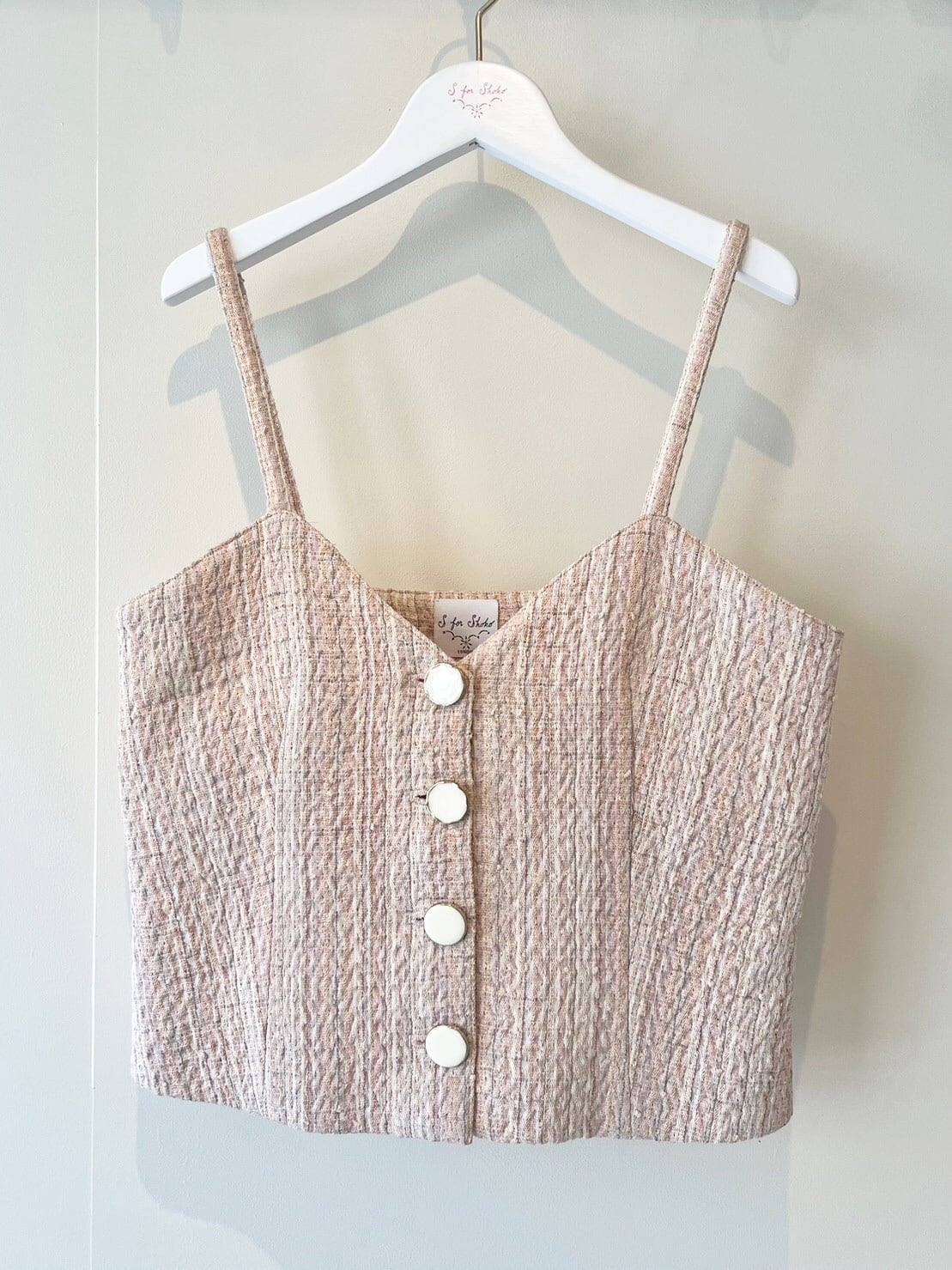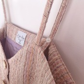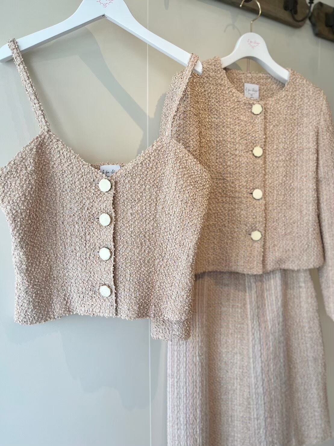 S for Shokoの毎シーズンのキーアイテムのひとつであるツイード素材。パリの工場で特別制作しています。今期は優しい色合いの3種類のツイードが登場。「ピンクベージュ」のストライプチェック、ベージュの「ループ」、「黄緑とピンク」のチェック。「ピンクベージュ」はストライプがクールな印象。今シーズン初登場するアイテム「ベスト」は、ロンドン直輸入のゴールド縁取りの白ボタンがポイントに。一枚で着ても、重ね着にも、ベスト一枚でコーディネートに良いアクセントとなるでしょう。同素材のスカートやジャケットとセットアップとして着るのも良し、デニムなどと合わせてカジュアルにも合います。他のどこでも見たことのない色合いと素材、上質なツイードの入門編としていかがでしょうか。
