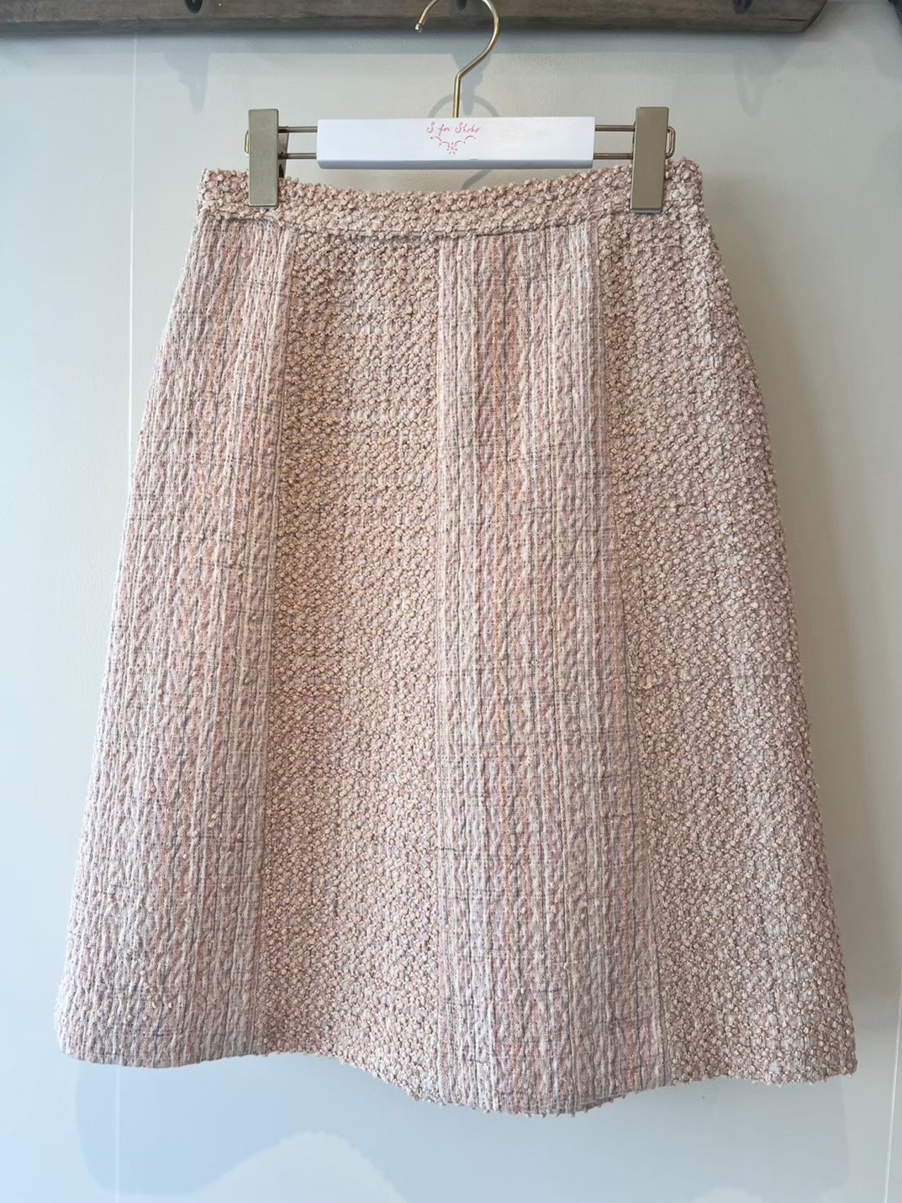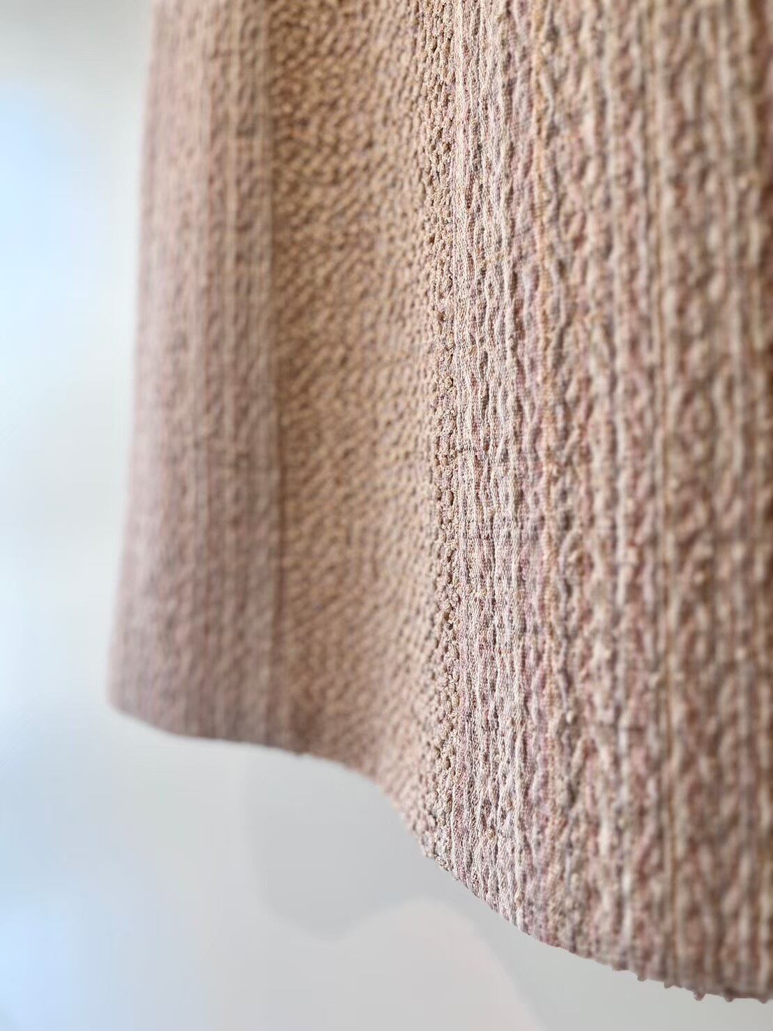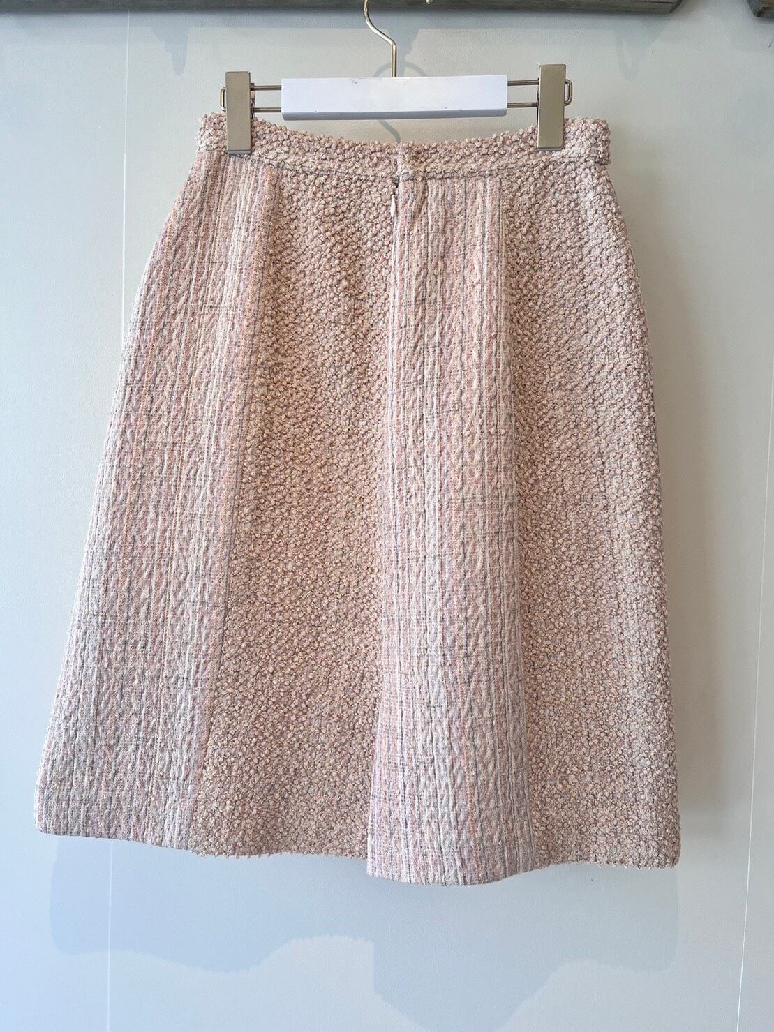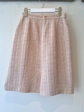 S for Shokoの毎シーズンのキーアイテムのひとつであるツイード素材。パリの工場で特別制作しています。今期は優しい色合いの3種類のツイードが登場。「ピンクベージュ」のストライプチェック、ベージュの「ループ」、「黄緑とピンク」のチェック。「ピンクベージュ」はストライプがクールな印象。履きやすく着まわしのきく膝丈スカートは、同素材のジャケットやベストとセットアップとして着ても、ニットやTシャツと合わせてカジュアルに着ても。他のどこでも見たことのない色合いと素材、上質なツイードのアイテムは、一生大切にできるアイテムとなるでしょう。