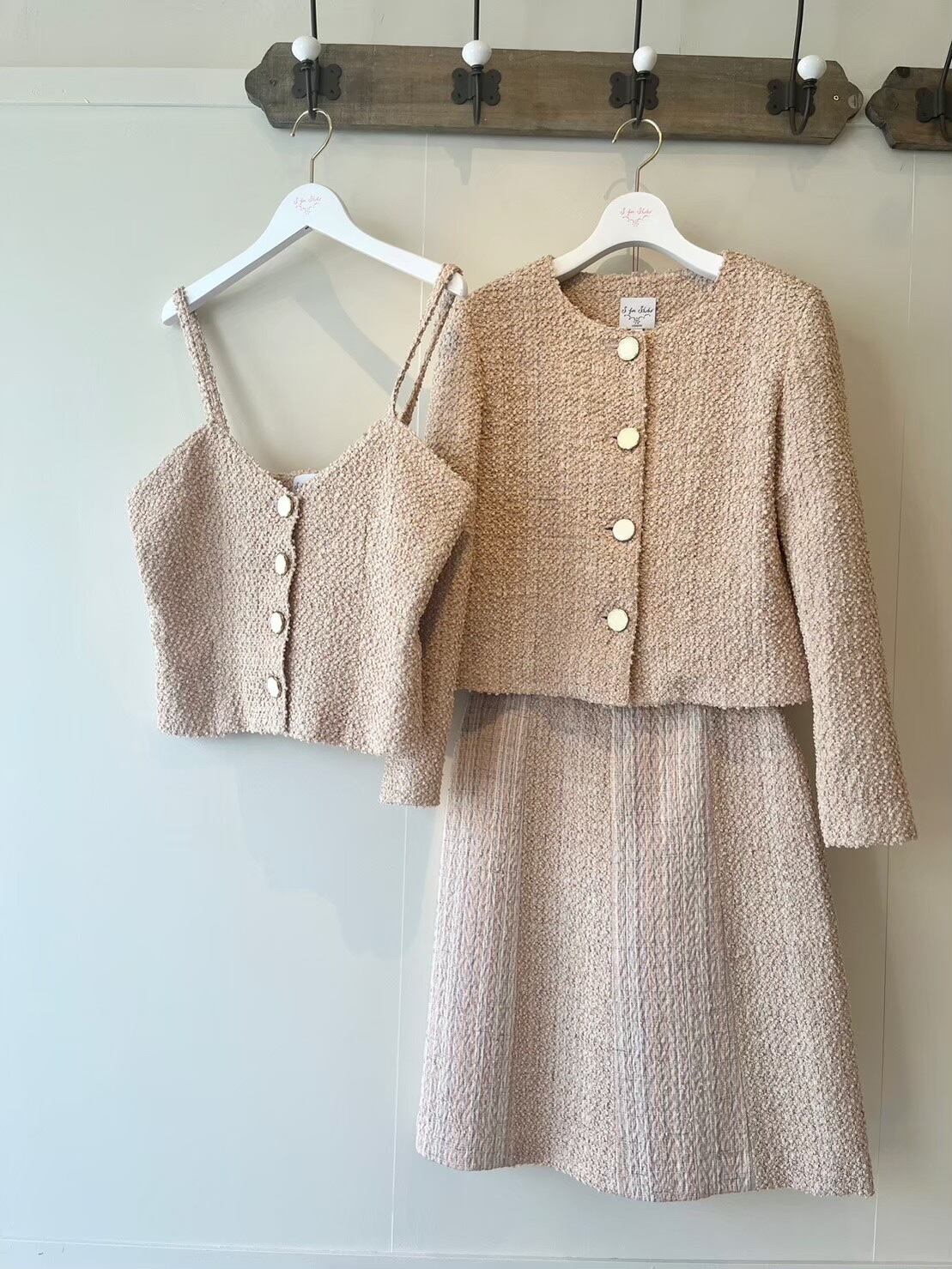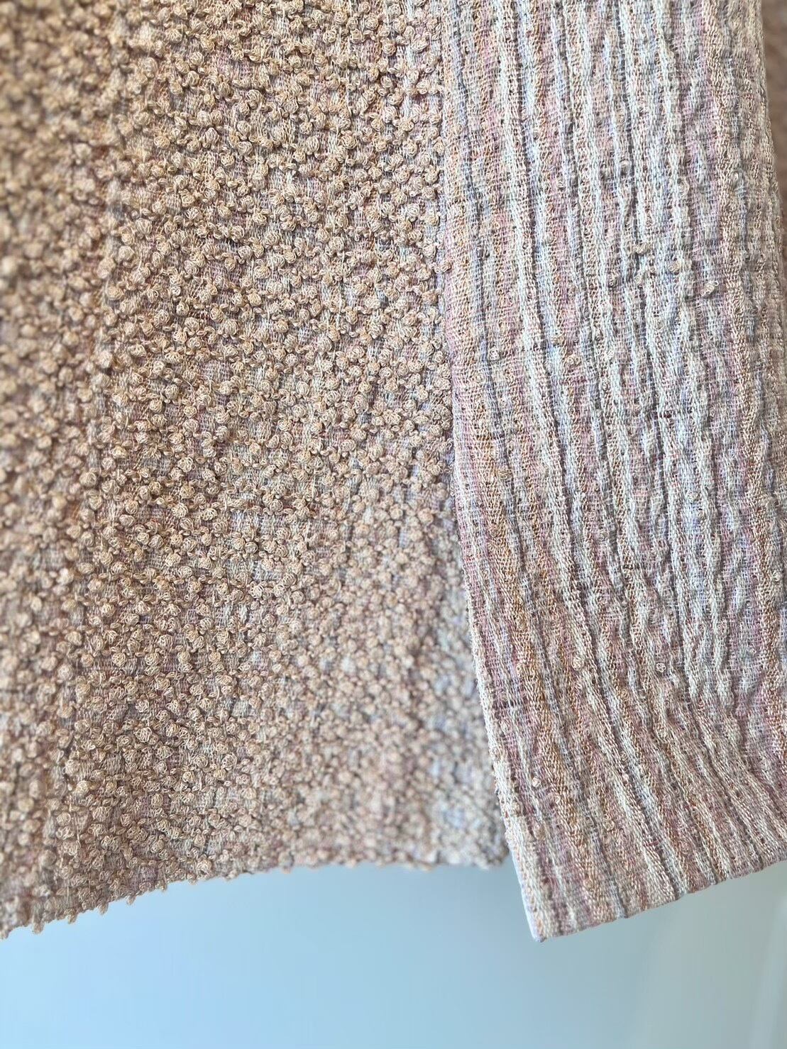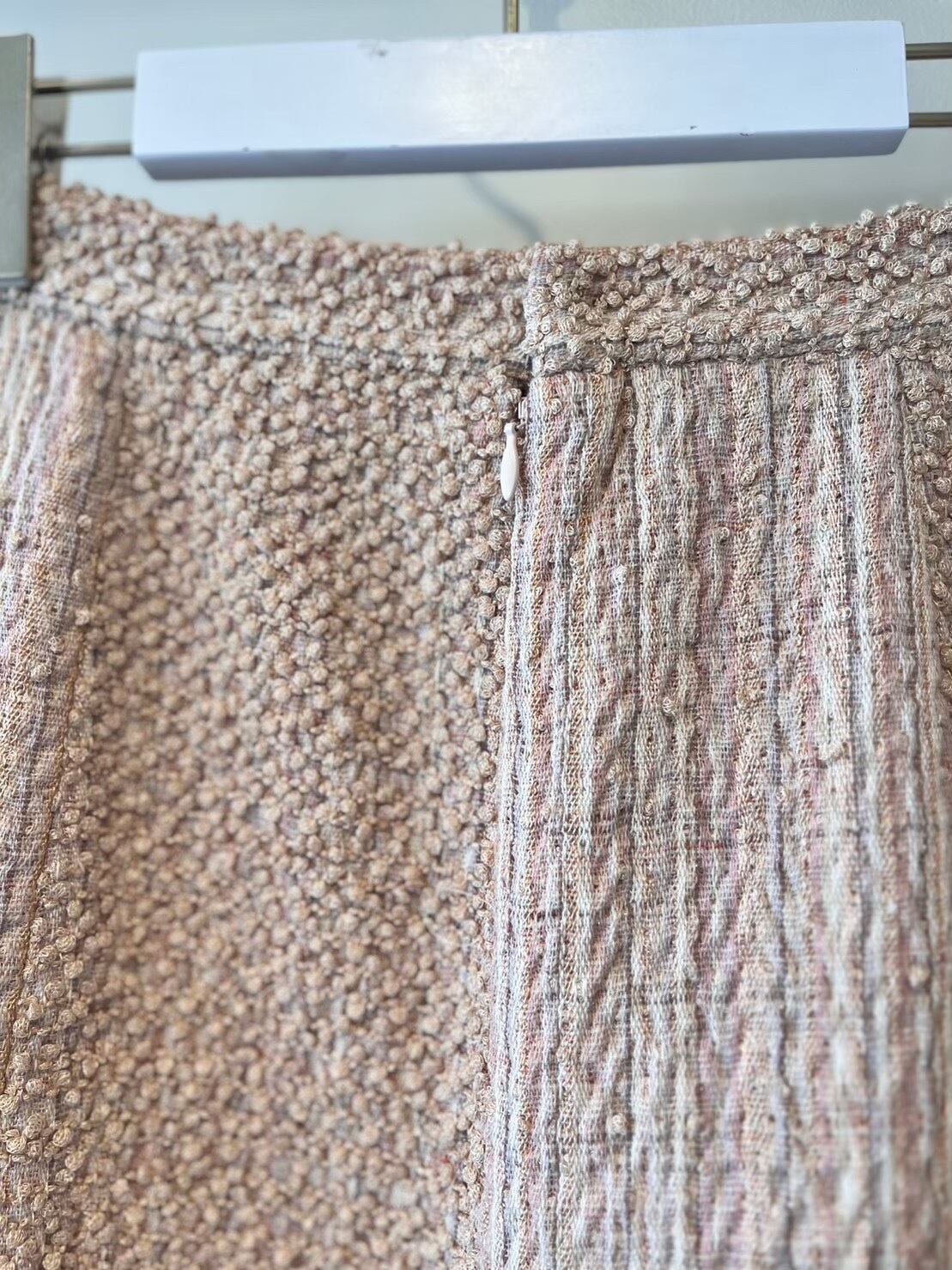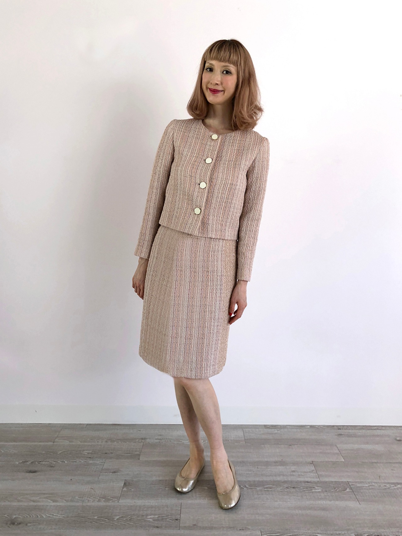 S for Shokoの毎シーズンのキーアイテムのひとつであるツイード素材。パリの工場で特別制作しています。今期は優しい色合いの3種類のツイードが登場。「ピンクベージュ」のストライプチェック、ベージュの「ループ」、「黄緑とピンク」のチェック。「ピンクベージュ」はストライプがクールな印象。履きやすく着まわしのきく膝丈スカートは、同素材のジャケットやベストとセットアップとして着ても、ニットやTシャツと合わせてカジュアルに着ても。他のどこでも見たことのない色合いと素材、上質なツイードのアイテムは、一生大切にできるアイテムとなるでしょう。