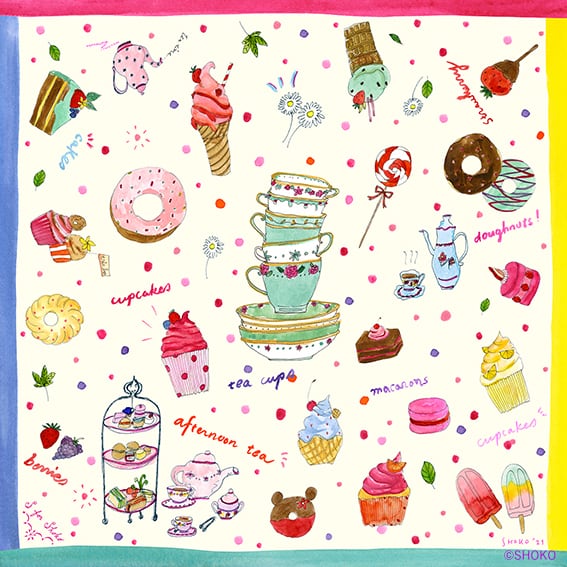 歴史あるロンドンのアフタヌーンティーは、ケーキにスコーン、サンドイッチにミルクティー、それを彩るカトラリーとテーブルセッティング、季節のお花と、空間の細部に至るまで気を効かせた演出が魅力ですが、こちらのスカーフは、デザイナーSHOKOがアフタヌーンティーをする人々のワクワクした気持ちをデザインにギュッと詰めてデザインした、と語る、思い入れの強い一枚。スイーツや食器がカラフルな色彩で描かれて、見ているだけで楽しい気持ちに。また縁取り4辺はピンク、ブルー、イエロー、グリーンとすべて違う色なので、巻き方によって様々な表情がお楽しみいただけます。艶やかな光沢を備えたシルク100%の柔らかな肌触りと、アレンジのしやすい大判のサイジングも魅力。装いにプラスするだけで、コーディネイトに華を添えるアイテムです。一年を通して大活躍するでしょう。