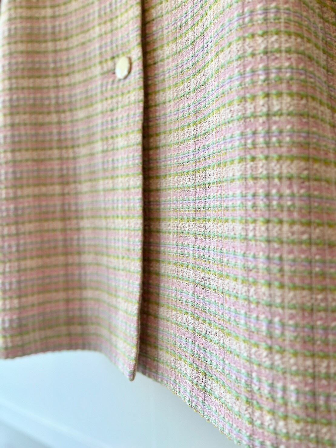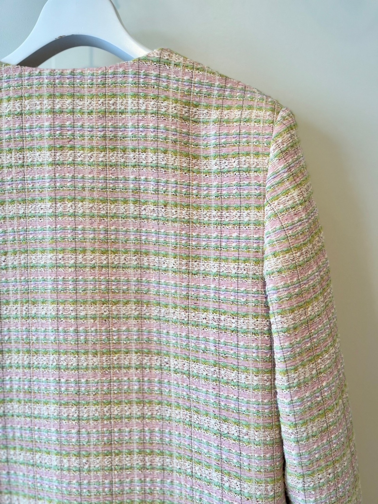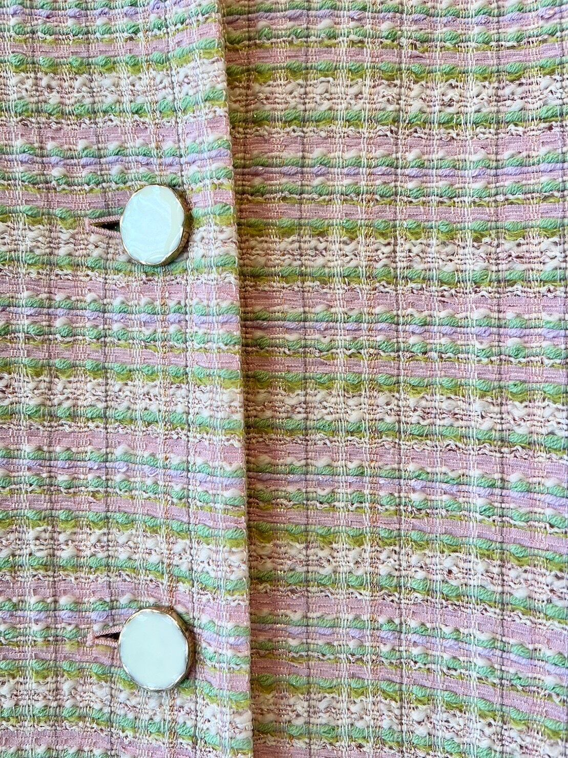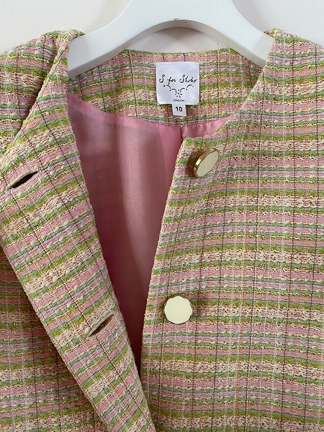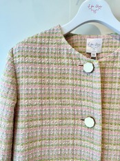 S for Shokoの毎シーズンのキーアイテムのひとつであるツイード素材はパリの工場で特別制作しています。ピンクx黄緑の可愛らしい「SKY」はエレガントそのもの。春のような色合いで、コーディネイトに明るさを加えます。ロンドン直輸入のゴールド縁取りの白ボタンがポイントになっています。他のどこでも見たことのない色合いと素材、上質なツイードでございます。