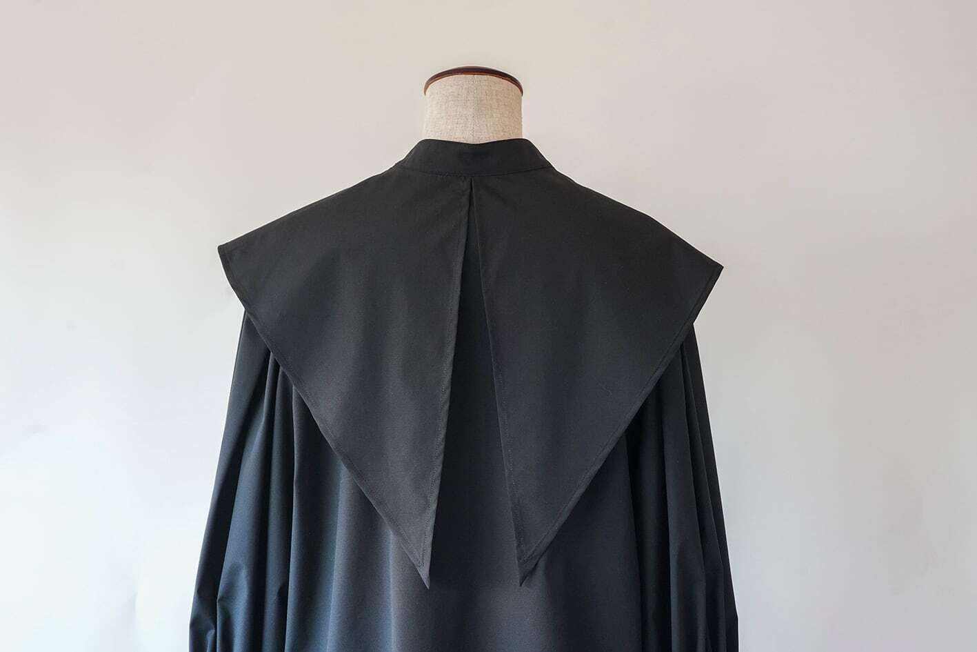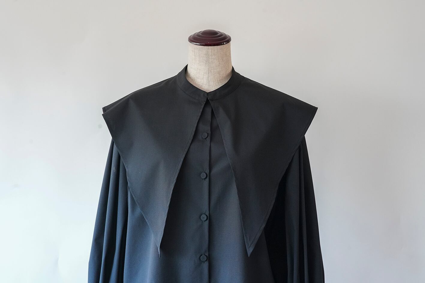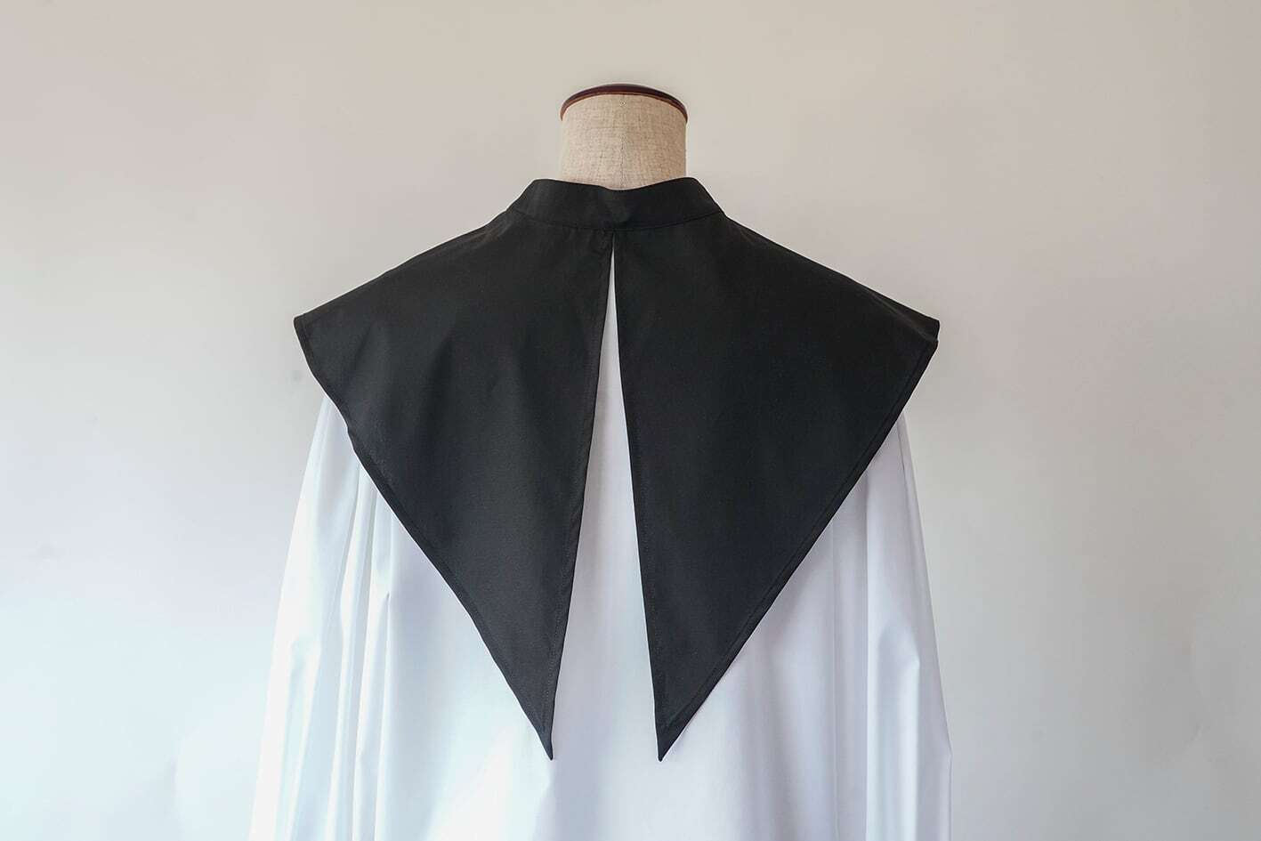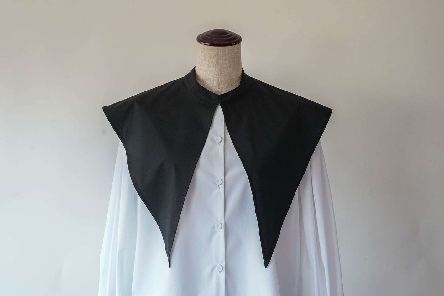 Amitiéオリジナルの付け襟です。首の後ろにある金ボタンを、専用のブラウスに装着し、前端のホック同士を掛けて、さらに、前端の糸ループをブラウスの第一ボタンに描けることで、ズレを気にすることなくブラウスに固定して楽しめる仕様となっています。