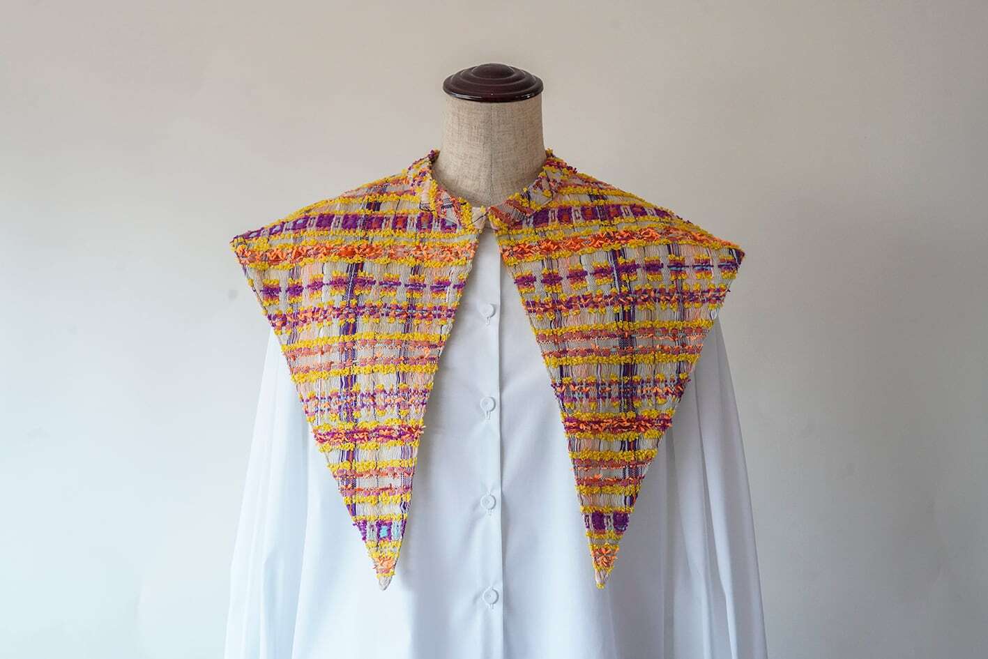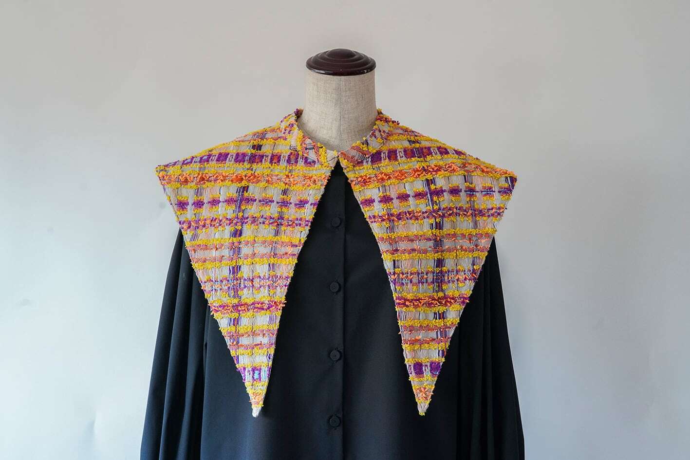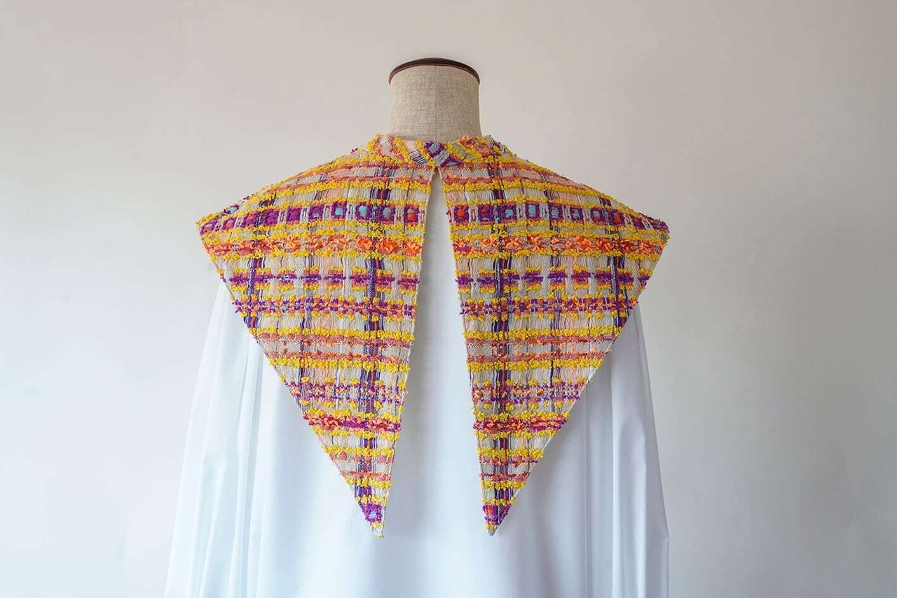 パリの工場で制作している一本一本の色の美しいツイードを襟全体に使った、贅沢な仕様の付け襟。