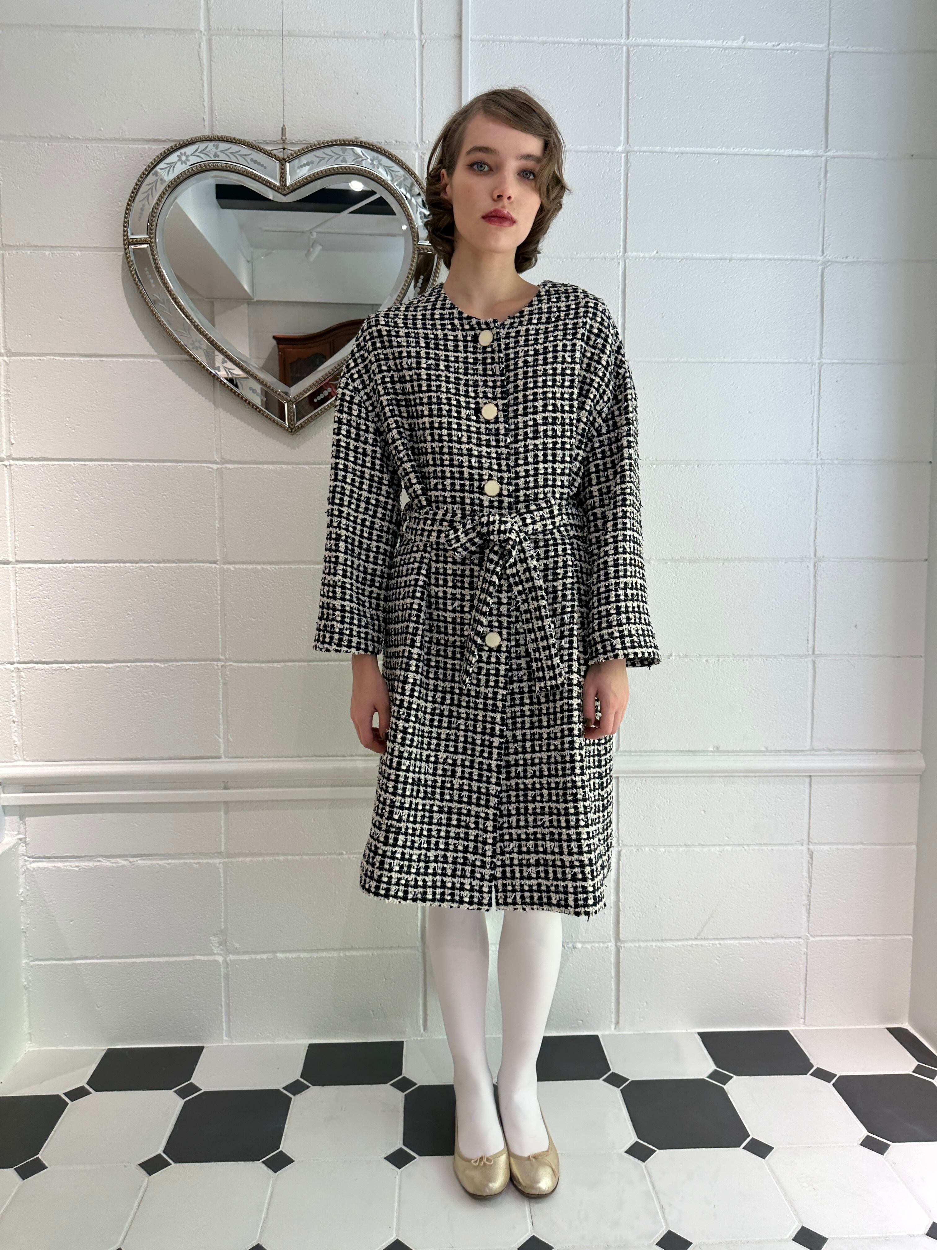 ざっくりとした形はモードで大人に印象に。肩の落ちたデザインとベルトが黒白ツイードのコントラストとのバランスが考えられたデザインです。