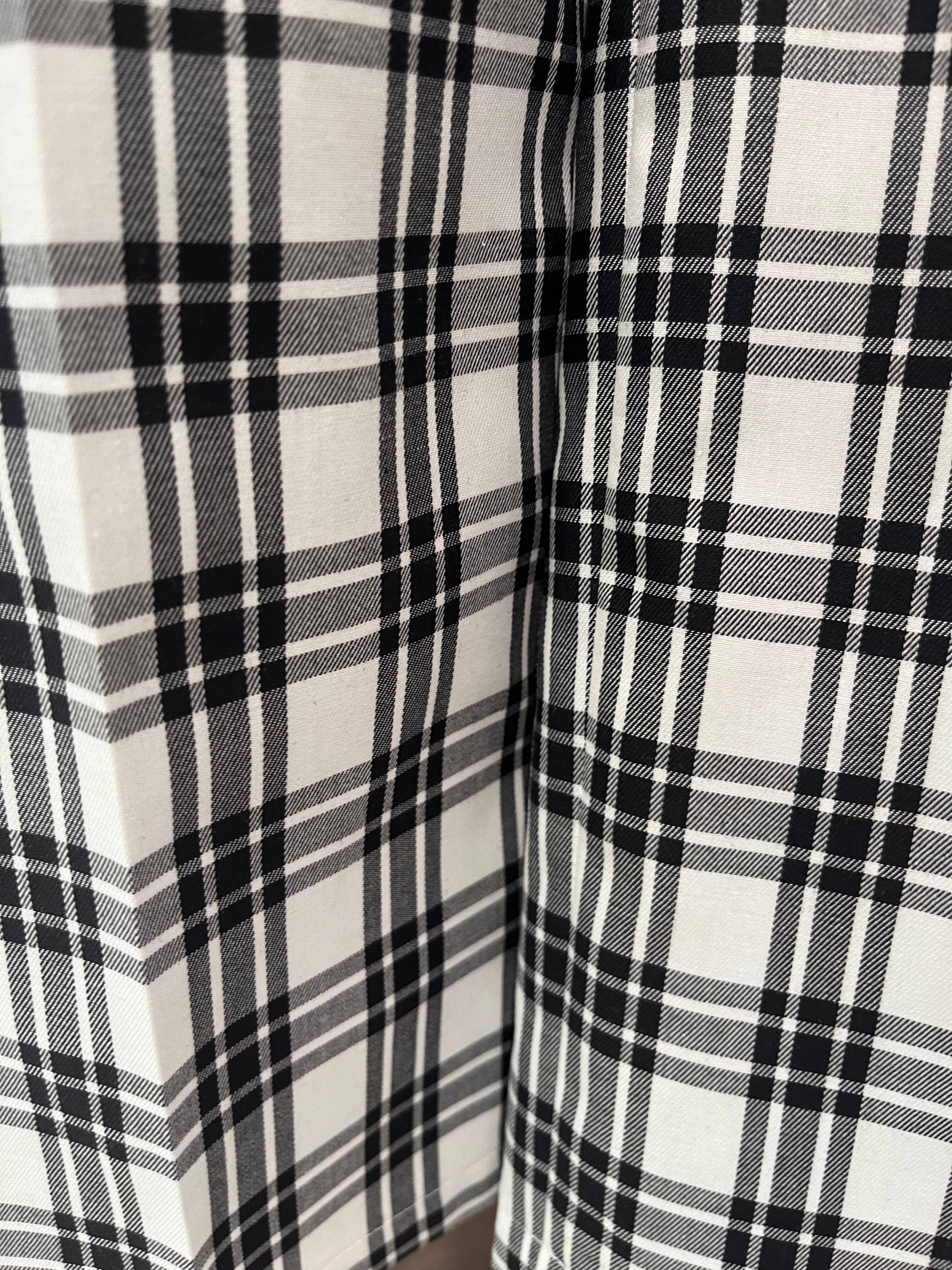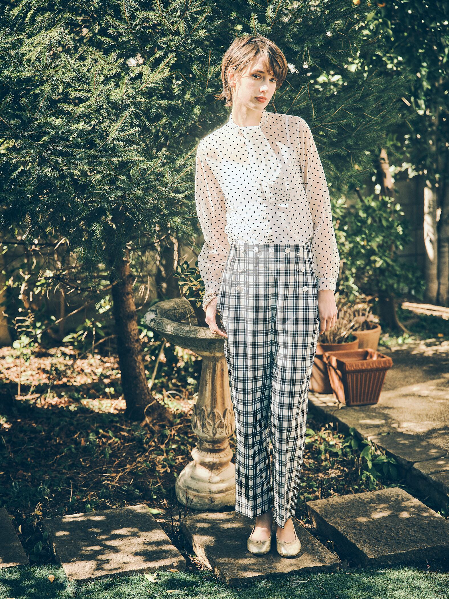 S for Shokoらしい大人にぴったりなパンツのデザインが完成しました。白黒チェックの生地使用したセーラーパンツは、カジュアルな中にも女性らしさと爽やかさを演出してくれます。高ウエストデザインで美脚効果もあり、足首まで美しく綺麗に形をつくったパターンは履くと