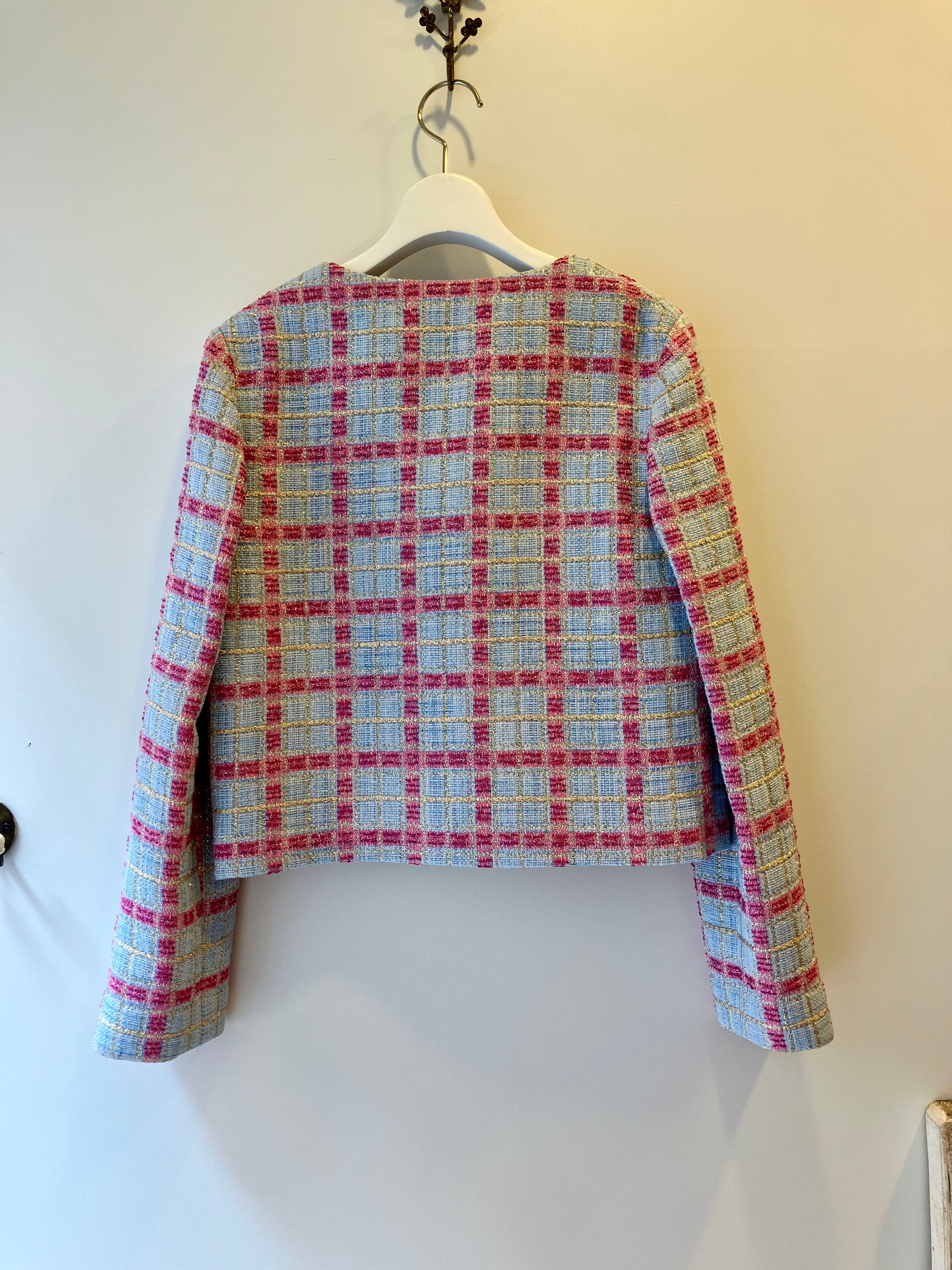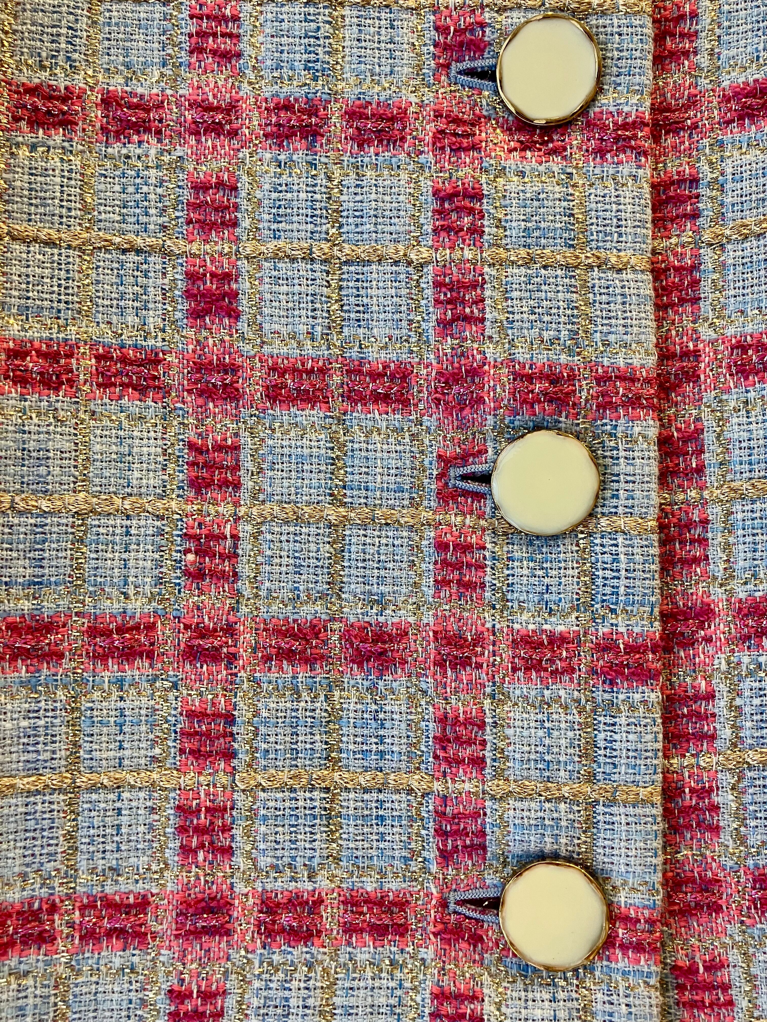 S for Shokoの毎シーズンのキーアイテムのひとつであるツイード素材。パリの工場でつくられたツイードは、水色、ピンク、ラメのゴールドの糸が組み合わせさった可憐で華やかなお生地です。