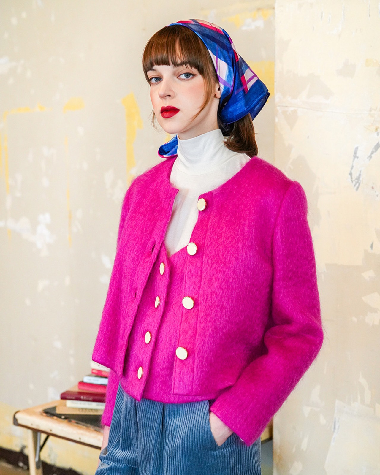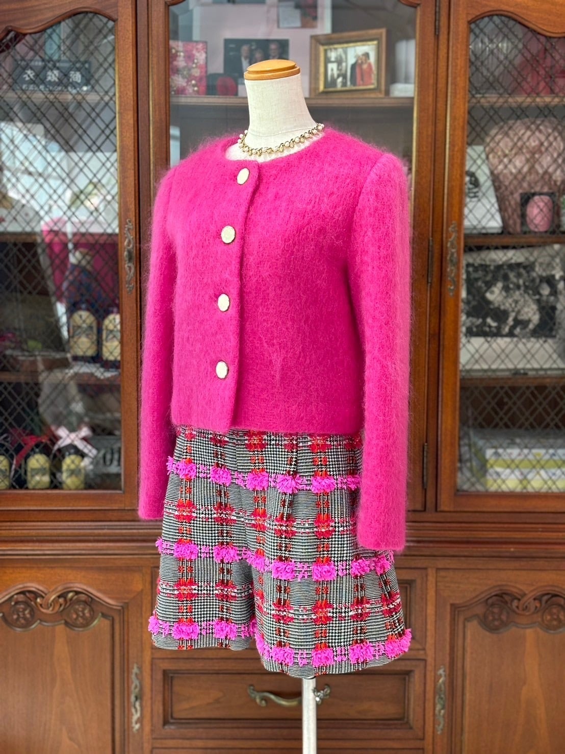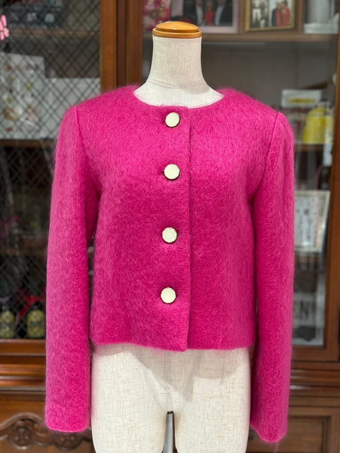 暖かみと風合いがお洒落な印象のモヘアの素材感とブランドらしい華やかなチェリーピンクのカラーが目を引く、バランスのとりやすい丈と、形の上品さが素敵なショート丈のジャケットです。