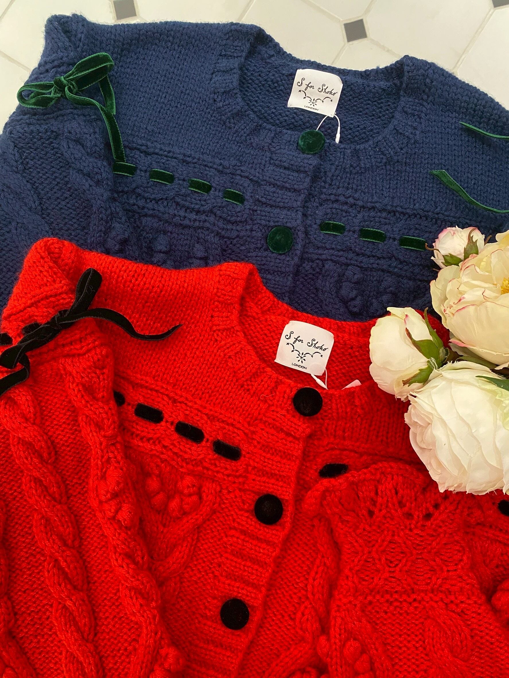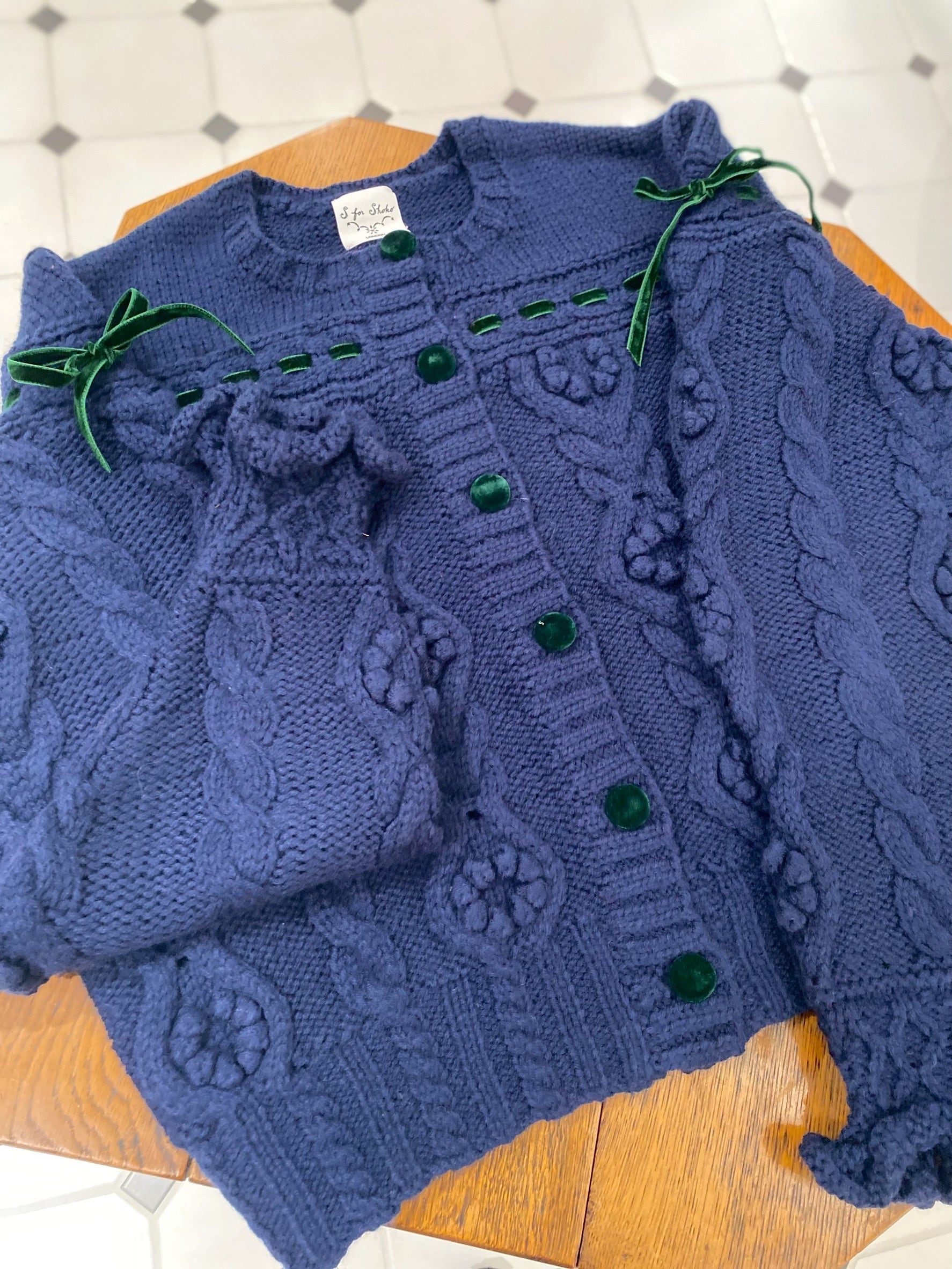 リボン・カーディガン 紺色ニット×モスグリーンリボン