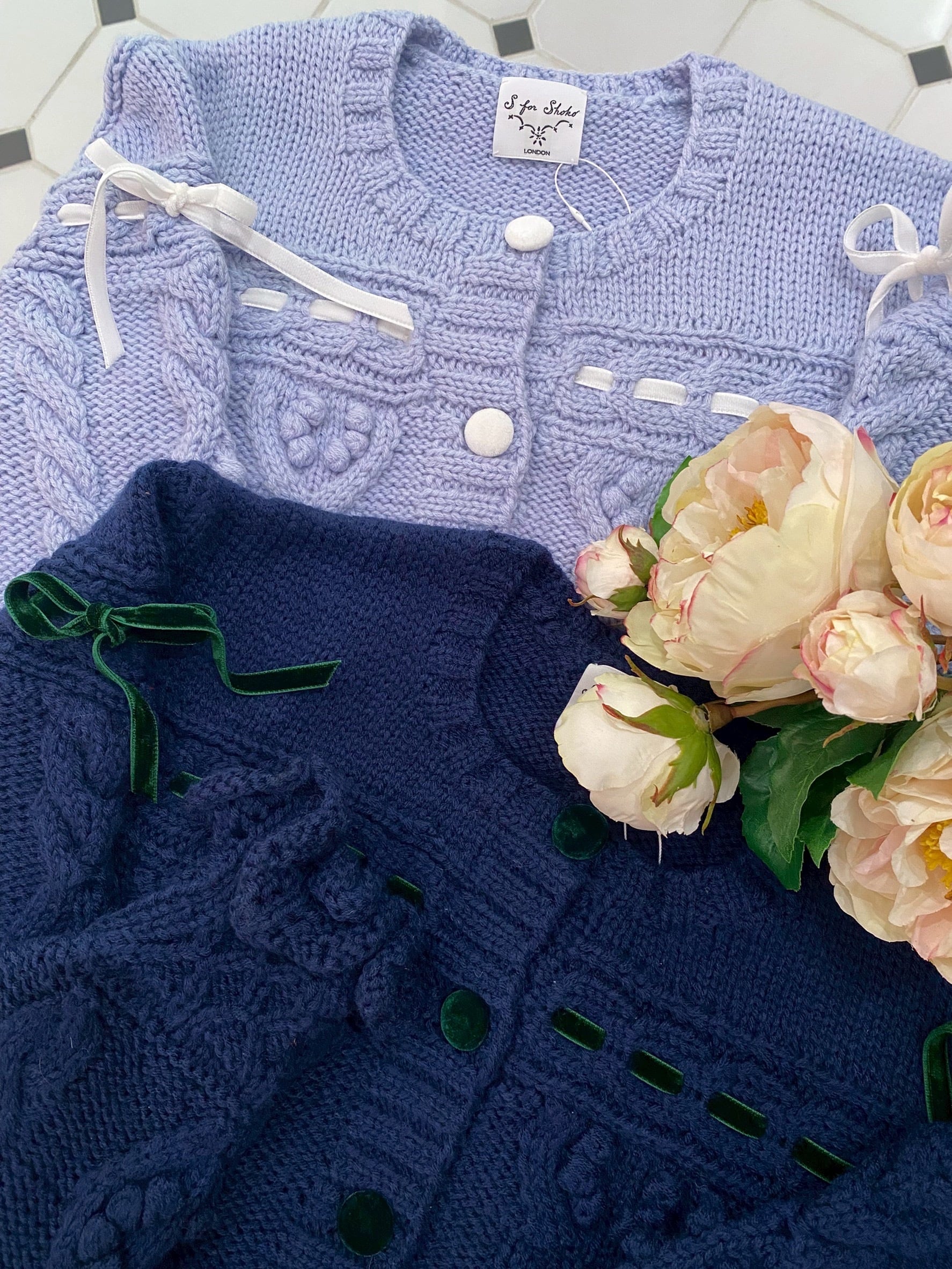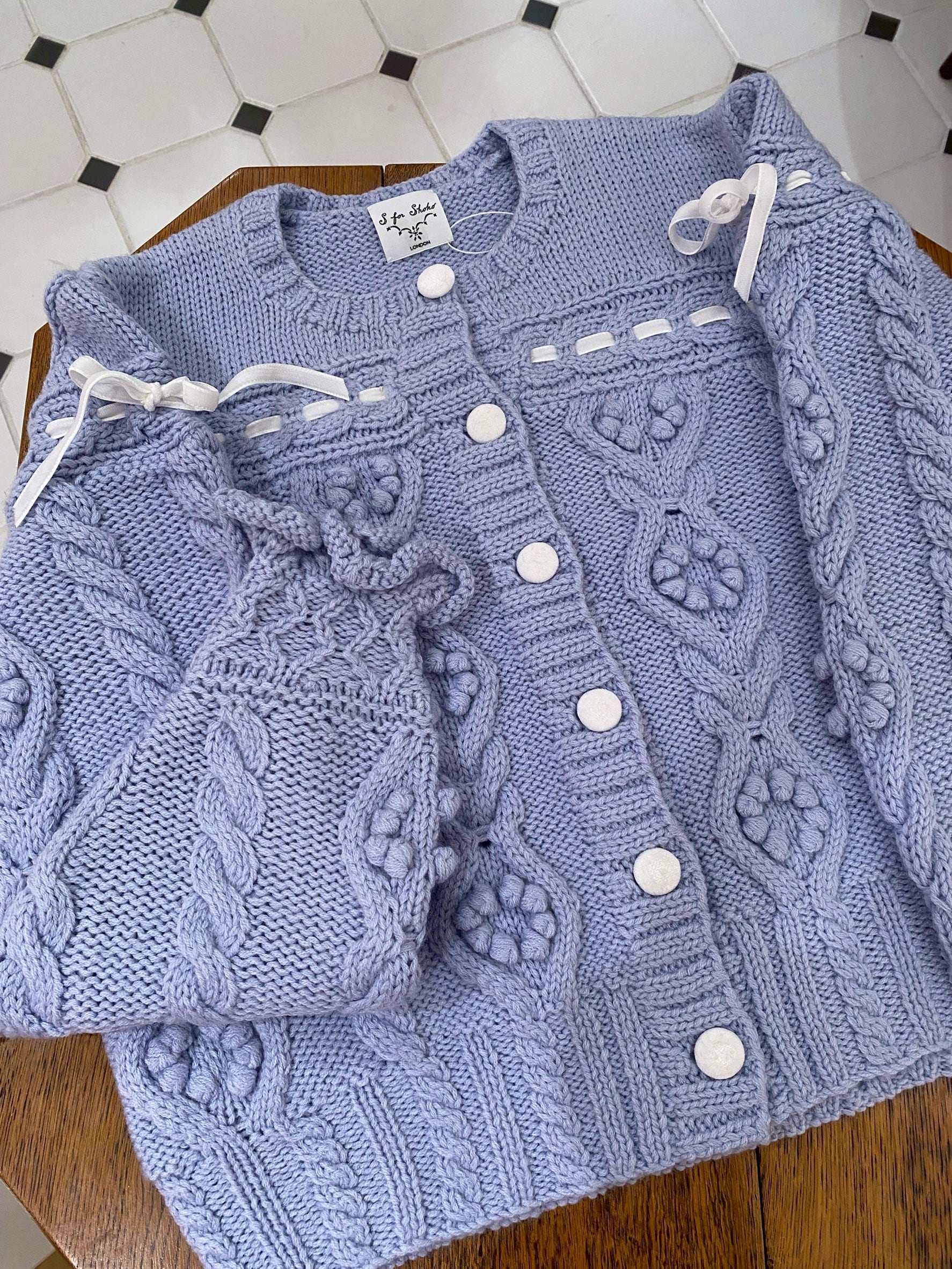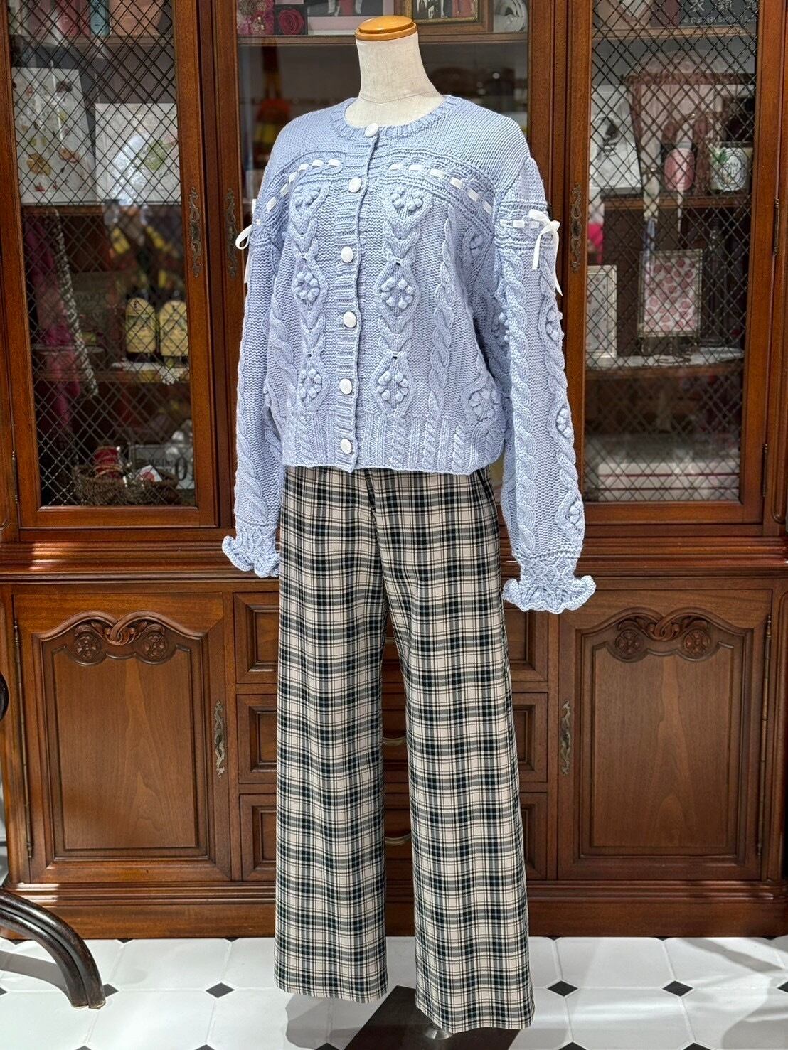 リボン・カーディガン 水色ニット×オフホワイトリボン