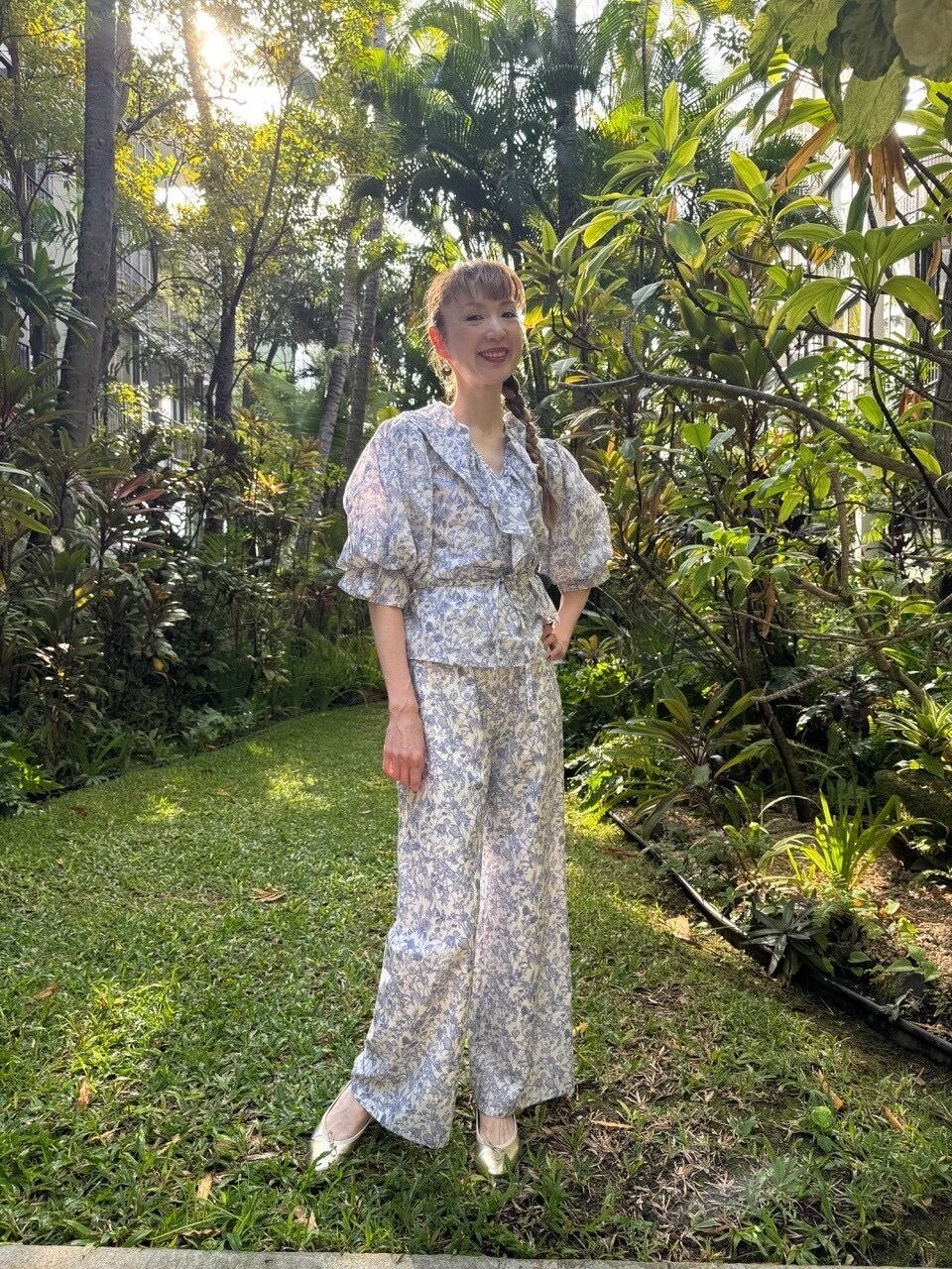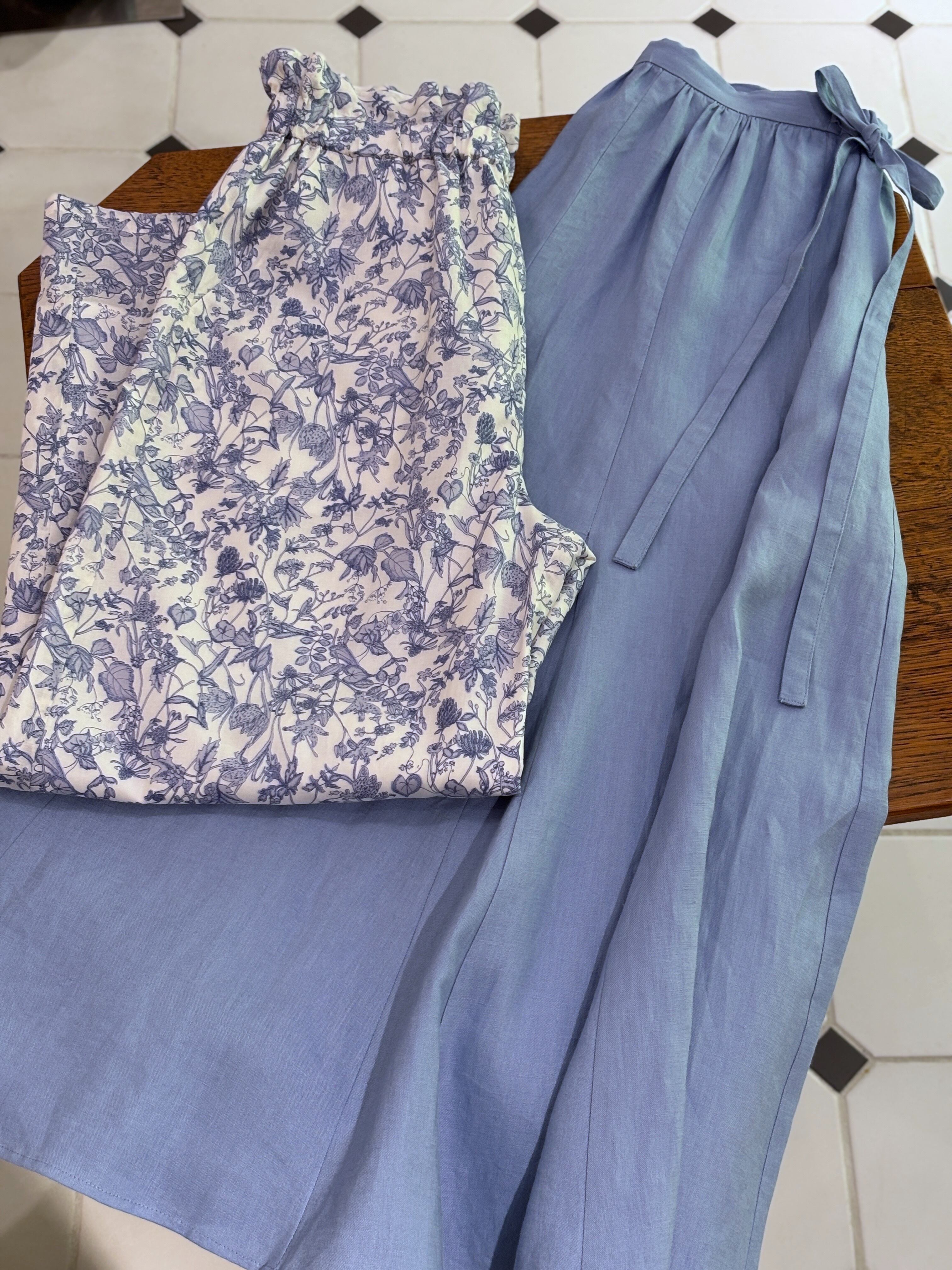 同生地のカシュクールブラウスとセットアップのコーディネートも